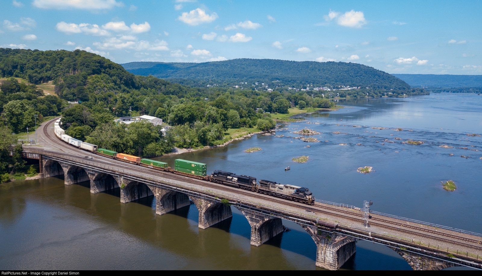 On a beautiful summer morning, NS 4004 leads Norfolk Southern train 20K (Chicago, IL-Croxton, NJ intermodal) across the Rockville Bridge.