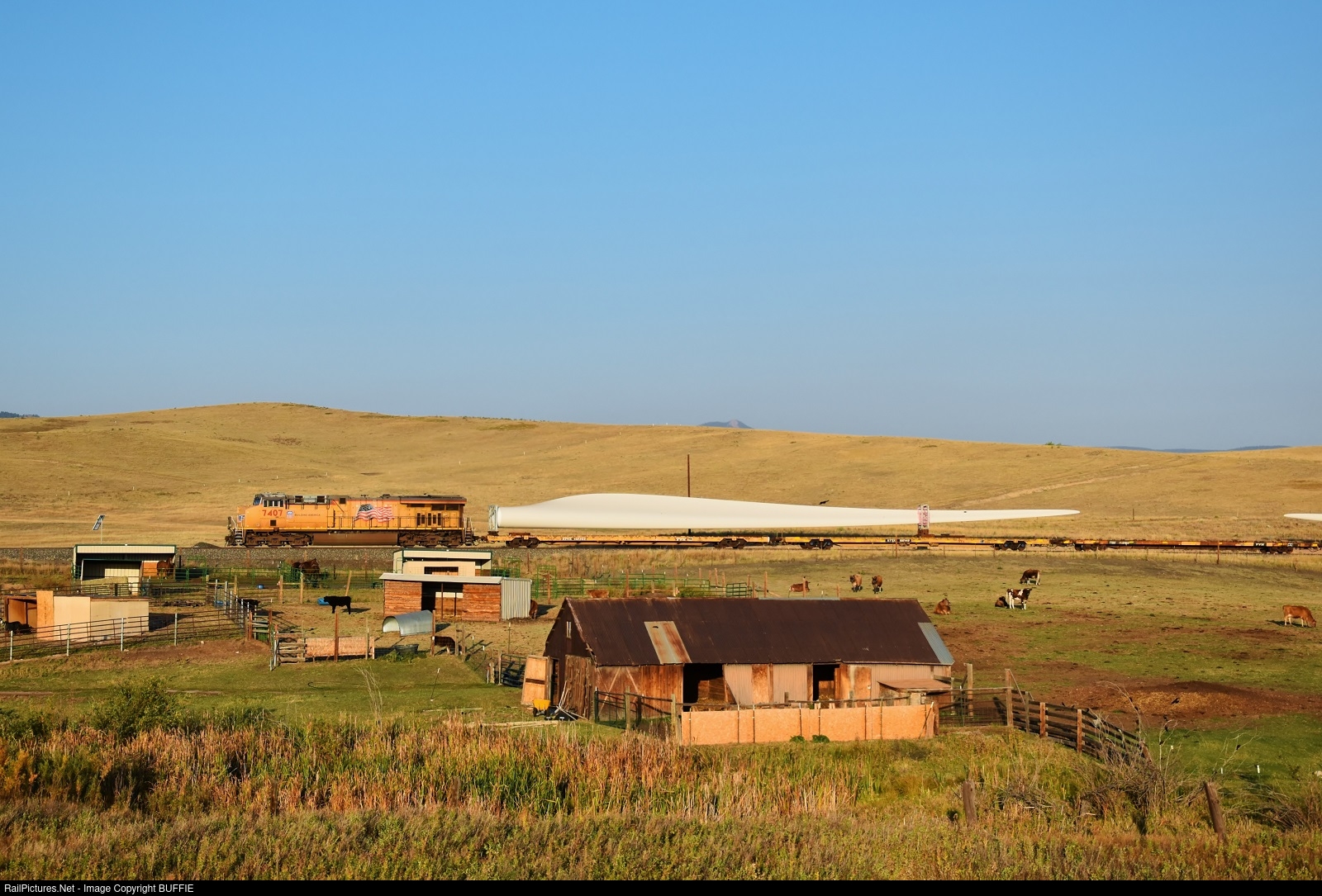 UP 7407 (AC45CCTE) pulls a windmill blade up the grade on the Joint Line train past a farm at Greenland, Colorado.