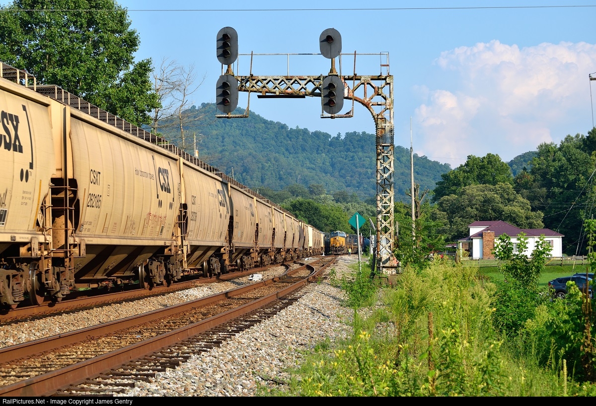 A CSX freight waits in the distance at Ford's Branch for a meet with a EB hopper train on the outskirts of Shelby Yard. The C&O era signal bridge still stands as of to this day.