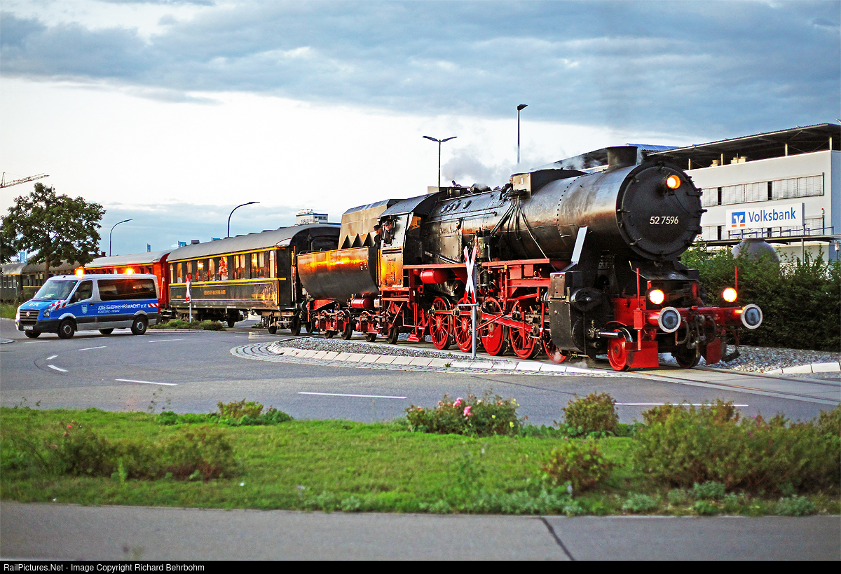 52 7596, a Kriegslok 2-10-0 BR 52 of association Eisenbahnfreunde Zollernbahn (EFZ), is crossing the "Volksbank traffic roundabout" with a charter train from Singen to Etzwilen. This heritage railway, a former SBB line, is 13 km long and was never electrified.