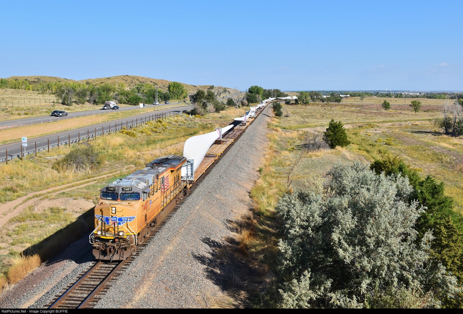 UP 7407 runs solo duty as it leads a windmill blade train south on the Joint Line through Nixon, Colorado.