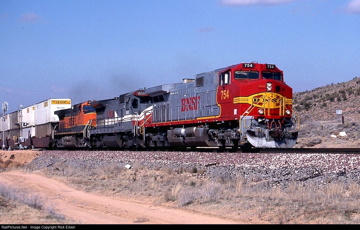 BNSF 754 slams across the Hackberry Road crossing with one of the Transcon's ubiquitous intermodal trains. An LMX B39-8 of BN heritage and a Heritage I Dash9 join this power set. Versus the original Santa Fe warbonnet logo, "BNSF" doesn't even come close.