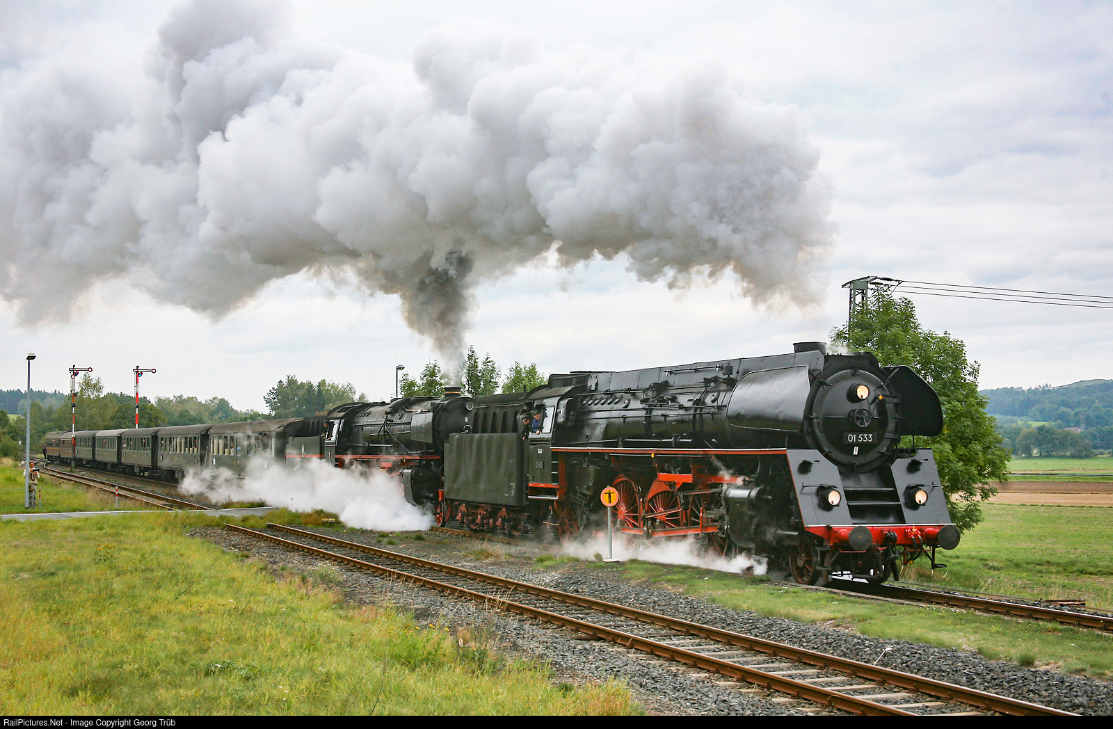 | Celebration of 160 years "Schiefe Ebene" ("slanted level"), the 2.5 % grade line from Neuenmarkt-Wirsberg up to Marktschorgast in northern Bavaria. 4-6-2 express train steamlocomotives 01 # 533 (of the austrian ÖGEG) and 01 # 202 (of association Pacific 01 202 in Lyss/Switzerland) are pulling the Nostalgie Rhein Express of the Eurovapor from Basel to Neuenmarkt-Wirsberg during a stop in Harsdorf. |