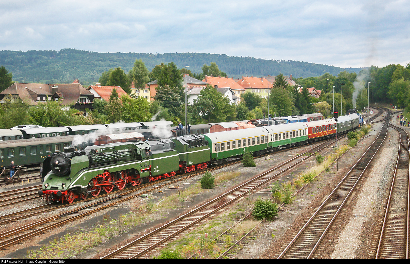 | Fastest operational steamlocomotive 18 # 201, built in 1961 by RAW Meiningen with using parts of several other locomotives, for fast test runs with cars built in the German Democratic Republic (GDR). The three cylinder, oil fired 4-6-2 locomotive has a maximum velocity of 180 km/h (never really reached). Here she is entering Neuenmarkt-Wirsberg on the occasion of the celebration of 160 years "Schiefe Ebene". There is a second, auxiliary tender used here for larger water and oil capacity. |