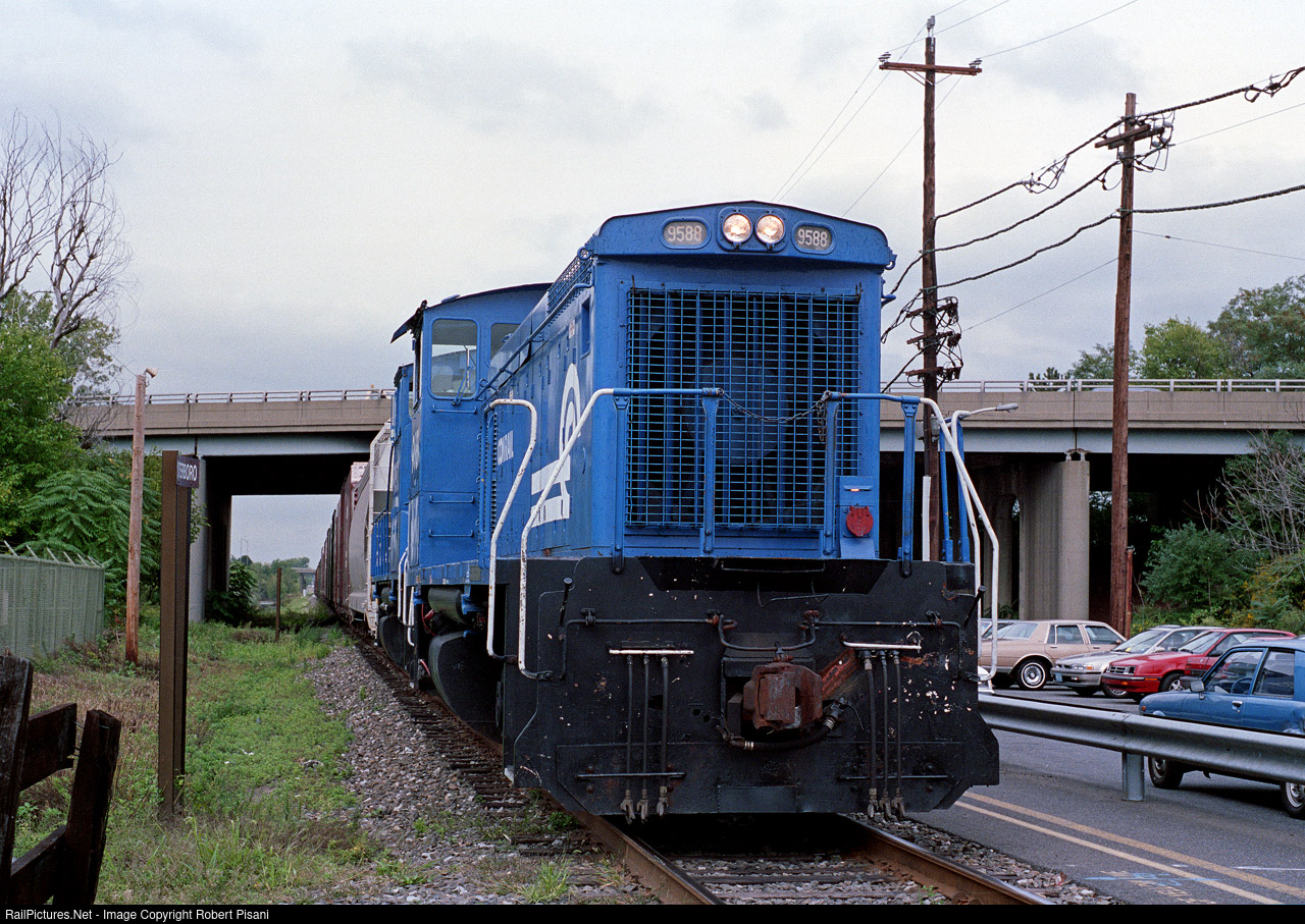 The crew of Conrail NB-31 has stopped their train at Teterboro station on NJT's Pascack Valley Line. Note that the consist includes mostly empty 86' auto parts box cars from the Ford Lead. There were not many dining options around this area at the time (unlike today), so the assumption is they walked across NJ-17 to the Bendix Diner for lunch. There were no midday commuter trains to interfere with at the time, either. A pair of SW1500s was not common on this job, but it did happen occasionally.