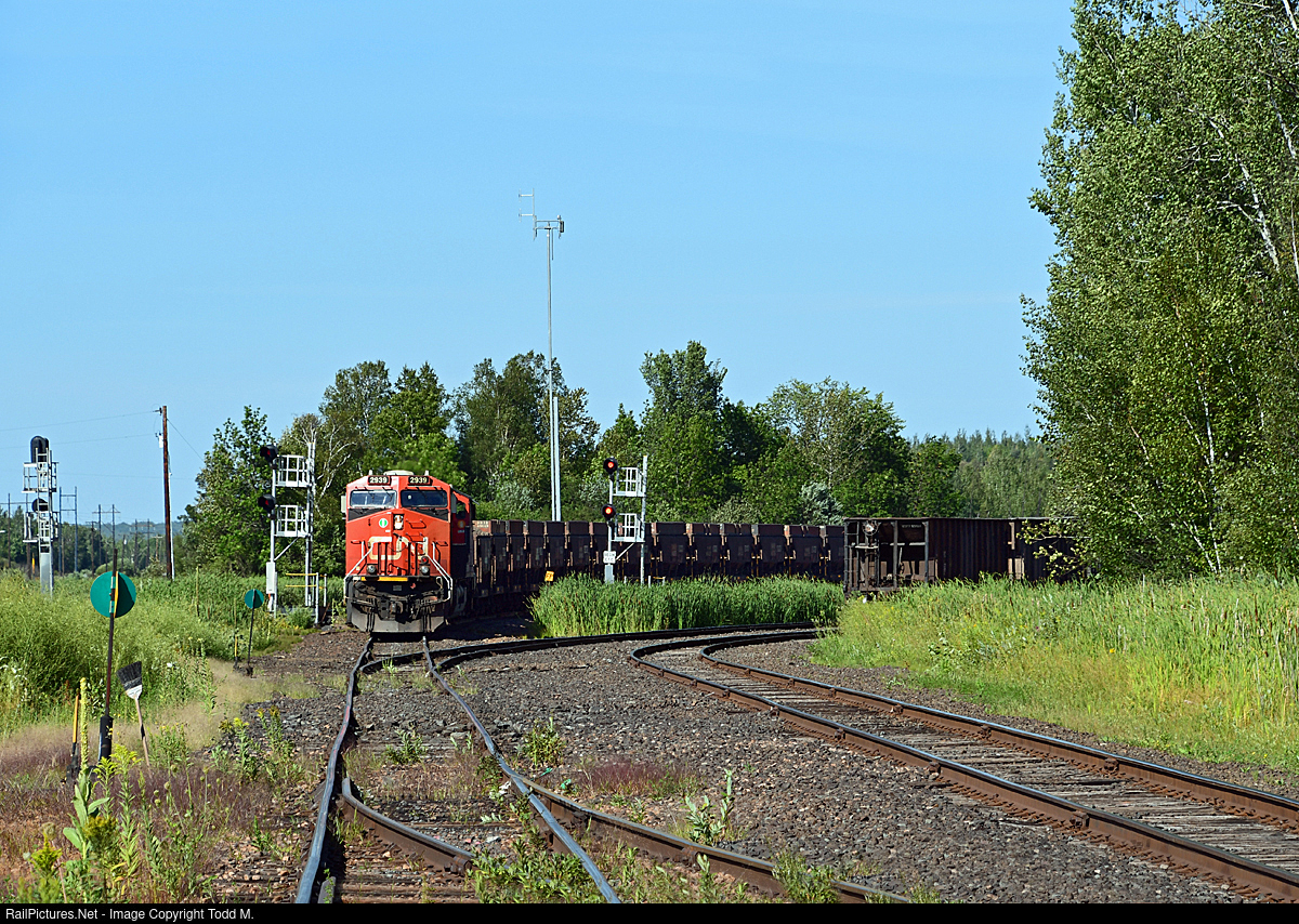 | CN 2939 steps off the Missabe Sub and briefly onto a section of track which is former DM&IR, complete with Missabe era date nails still in the ties. These two foreground tracks are used by a rock crushing operation on nearby United Taconite property that crush taconite rock for blast furnace trim and waste rock for other uses and they interchange with CN who drops off empties and picks up loads. |