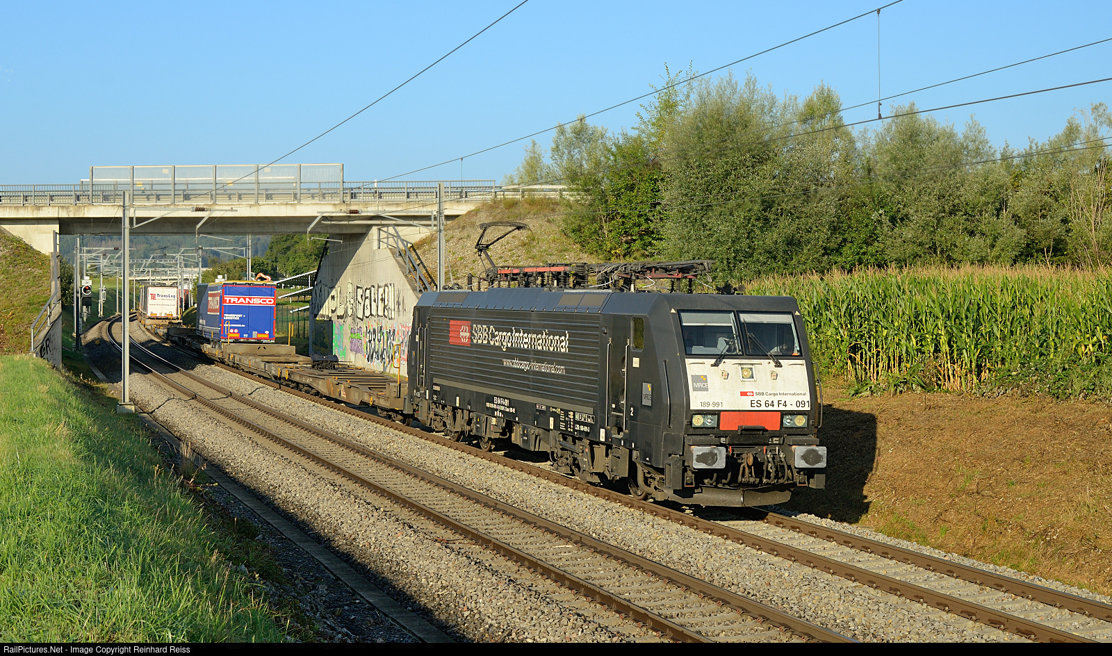 | MRCE 189 991 (rented by SBB Cargo) passes Jestetten area with northbound intermodal 42048 from Gallarate (Italy) to Singen (Germany). |