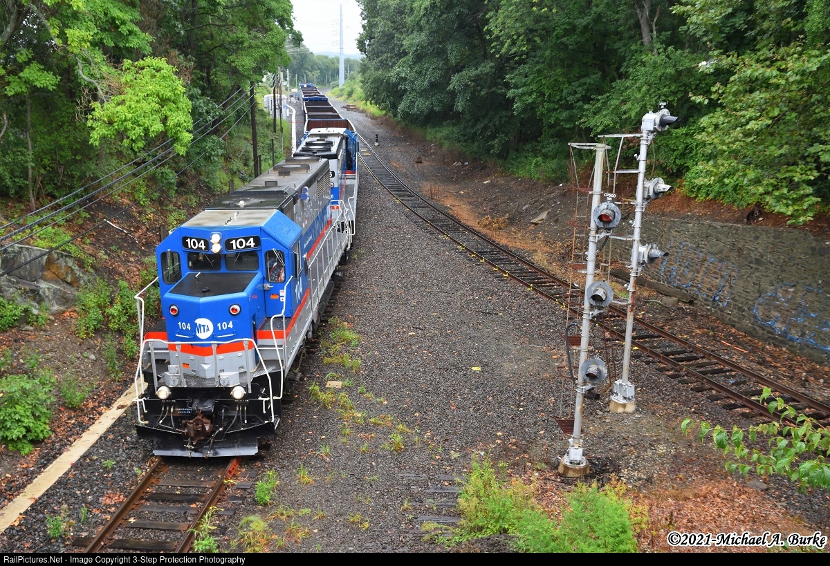 A pair of Metro-North GP35Rs traverse the west leg of the Devon wye at CP-500 in Milford, with an empty ballast train heading back to Bridgeport yard. Starting on June 1, the Waterbury Branch has been shut down for critical infrastructure work on the track, passing sidings, and signals.