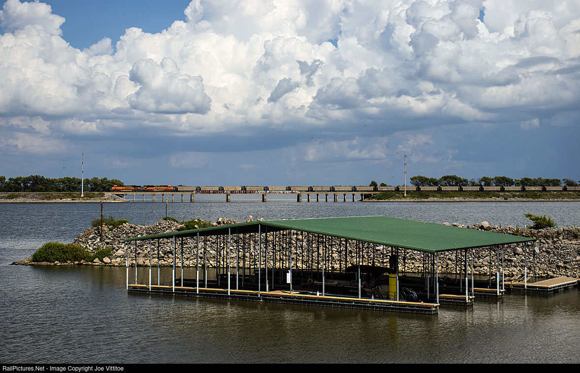 Storms build in the east as an empty BNSF coal train heads back for another load as it passes over Carlyle Lake.