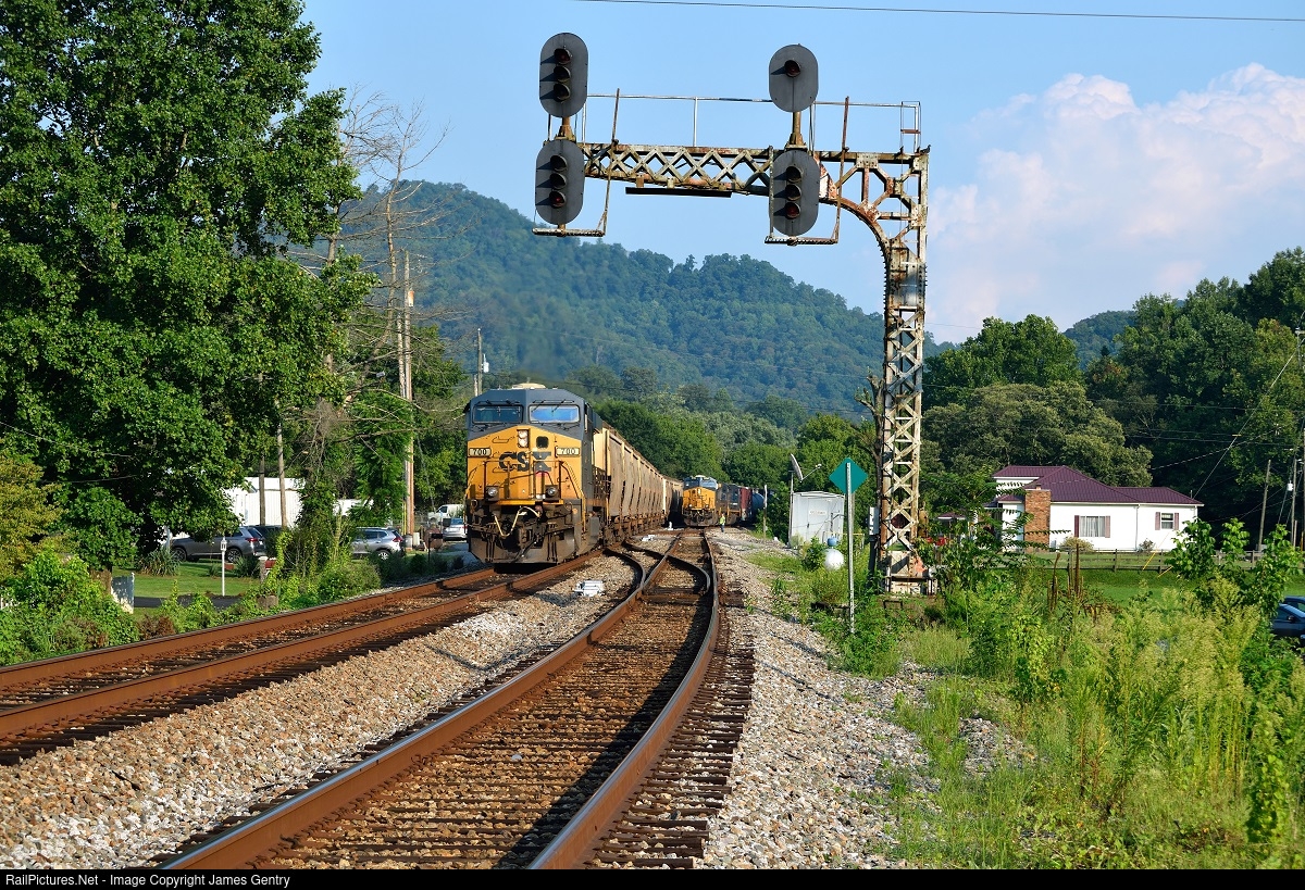 A CSX freight waits in the distance at Ford's Branch for a meet with a EB hopper train on the outskirts of Shelby Yard. The C&O era signal bridge still stands as of to this day.