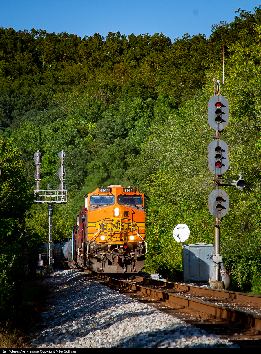 Staring into the sunlight, BNSF 4141 leads ethanol train K477-02 through the control point at CH Cabin on CSX's Big Sandy Subdivision. Three BNSF units sandwich UP 1988, the MKT heritage unit, as they pass an array of C&O era signals still in service on the 125-mile long line between Catlettsburg and Elkhorn City, KY.
