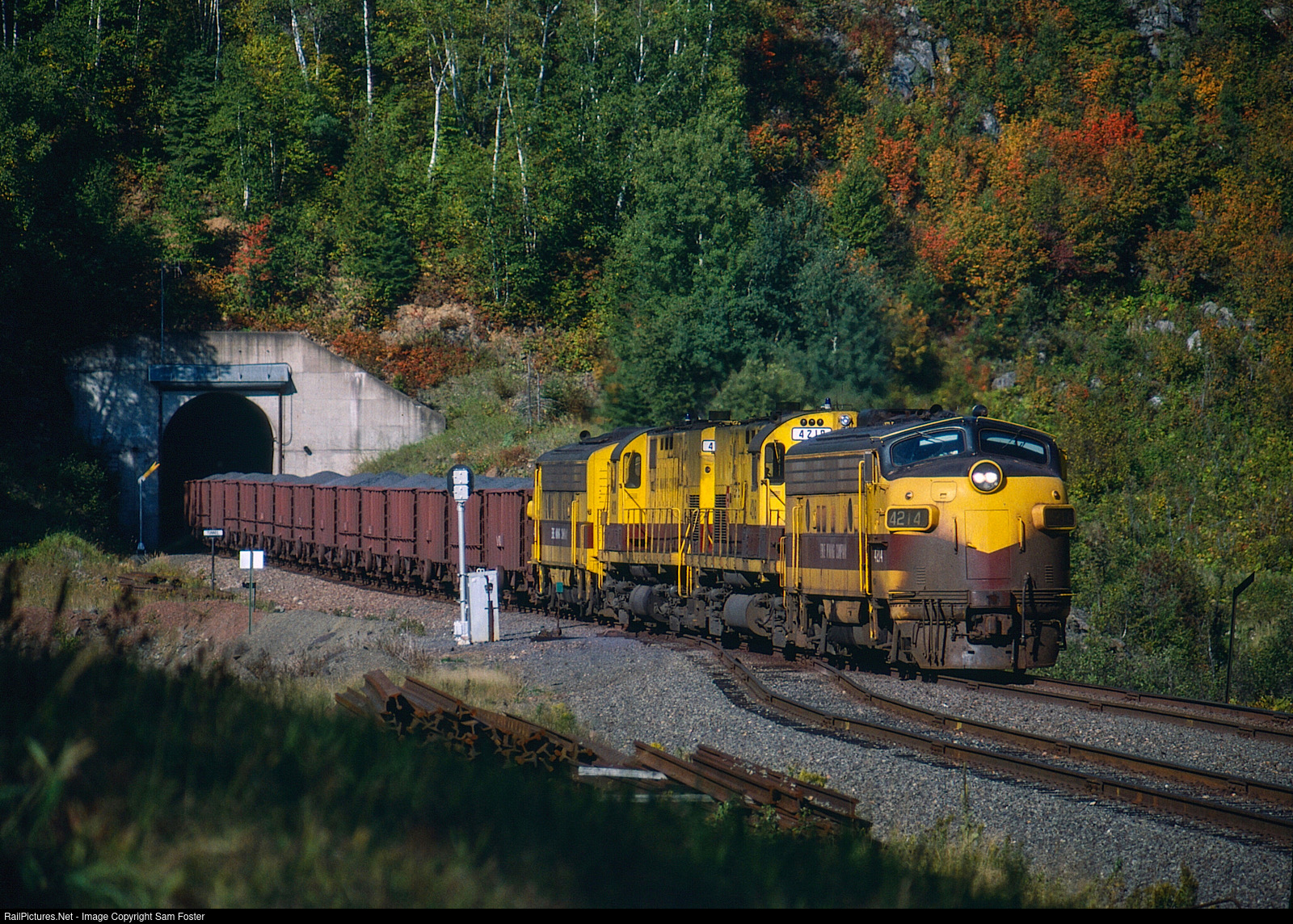 On September 16th, 1989, two Erie Mining F9As and a pair of C420s lead a loaded ore train through the tunnel at Cramer, Minnesota. Original Slide. Mike Cleary Photo. Sam Foster Collection.