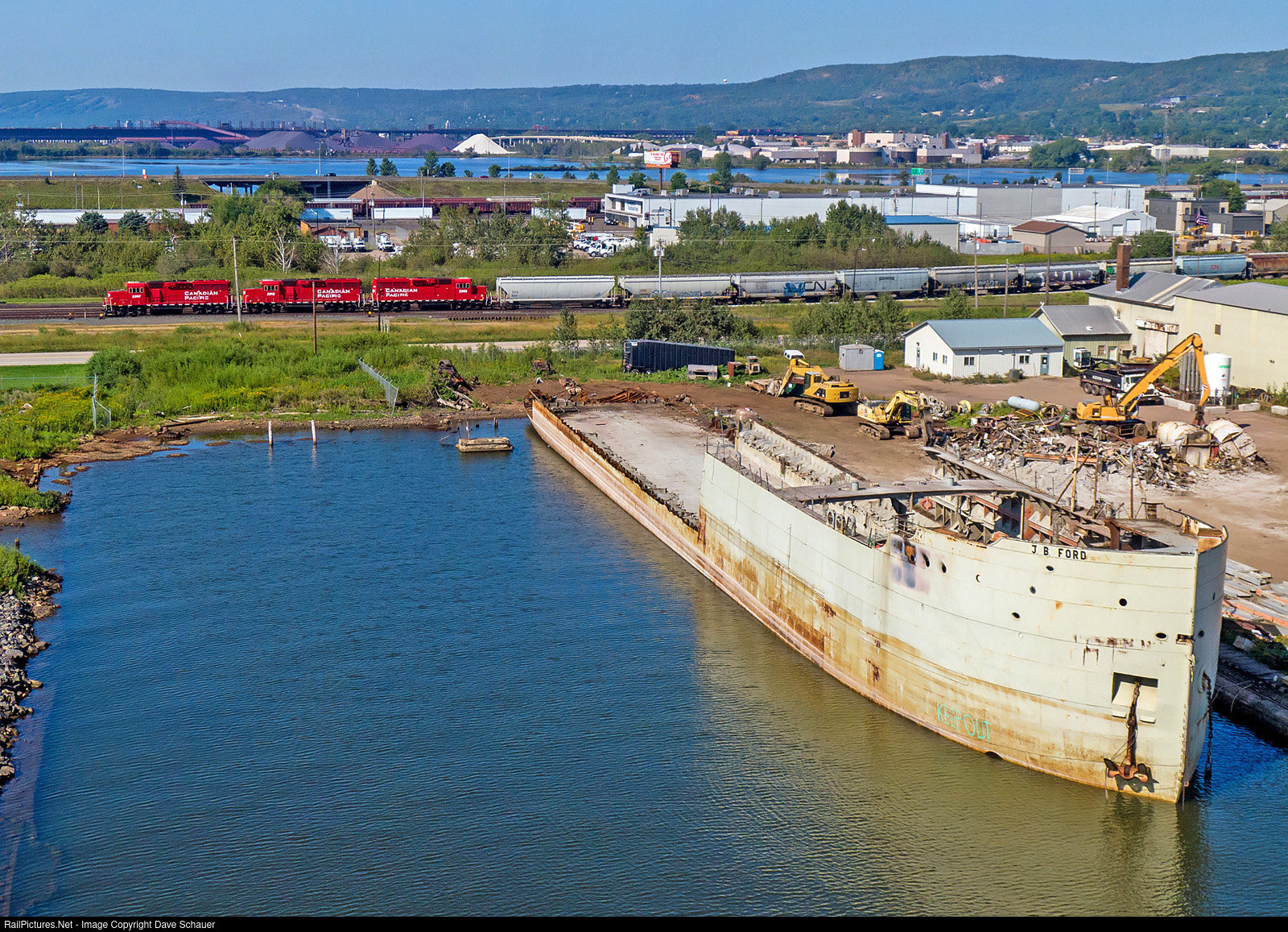 A trio of CP rebuilds roll a transfer past the retired ore/cement carrier J.B. Ford that is in the process of being scrapped.