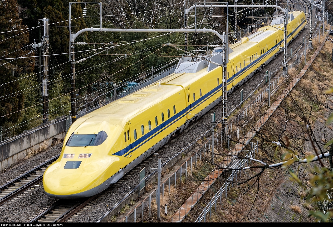 The Shinkansen Class 923, nicknamed "Doctor Yellow", seen here passing Sekigahara on a cloudy winter afternoon. Heavily modified from the Shinkansen 700 Series, only two sets of the Class 923 were built and operated for the purpose of high-speed tests and railway inspections. Not only the whole yellow body paint, please note fewer number of the window and the nose camera window under the head lights. [Nikon D500, Nikkor 24-120mm F4]