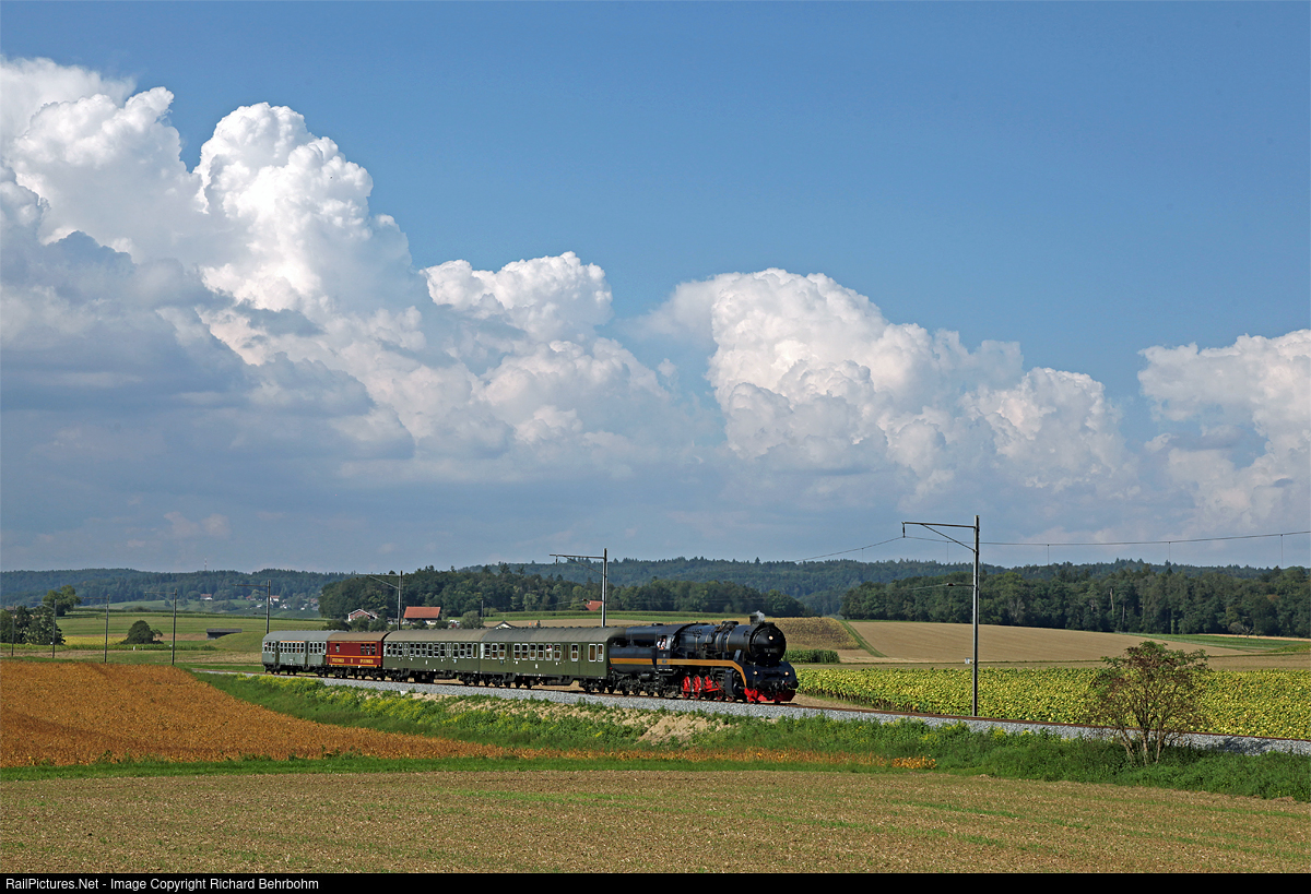 | This light oil fired locomotive is a former Deutsche Reichsbahn 2-10-0 steamlocomotive, owned and operated by the Dampflok- und Maschinenfabrik (DLM). 52 8055 heads a charter train with cars of Eisenbahnfreunde Zollernbahn e.V. |