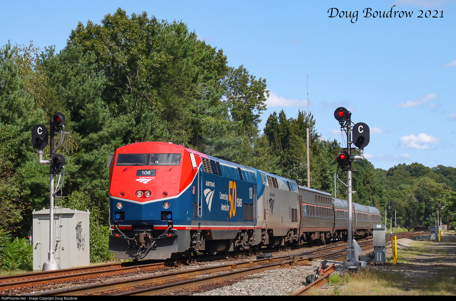 A break from the posts from my recent trip to California, the Boston section of the Lake Shore Limited is seen passing some of the last New York Central searchlight signals on the Boston Line at CP-11 in Weston, MA. One of the 50th-anniversary units with the "Phase VI" paint is leading another P42 and a four-car train.