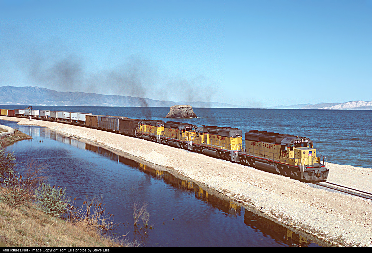 Four Union Pacific SD40-2's come rolling off the Western Pacific causeway 3593, 3312, 3634, and 3472. How things have changed. The causeway was still really a causeway, Black Rock was still an island, and the water wasn't a quarter mile away from the track. Today the weeds are all grown up in this area. Plus the freeway has cement barricade all along here. If you do stop there is a chance the highway patrol is going to come pay you a visit. (Tom Ellis photo)