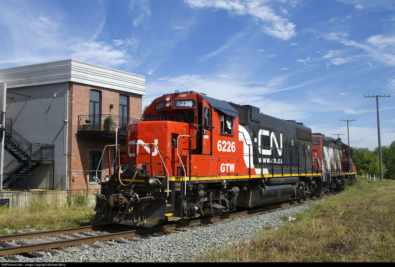 | After waiting for CN 120 to pass, the Pointe St-Charles Switcher with GTW 6226 & CN 4141 for power has its signal so that it can leave the East Side Canal Bank Spur after dropping off grain cars at Ardent Mills. |