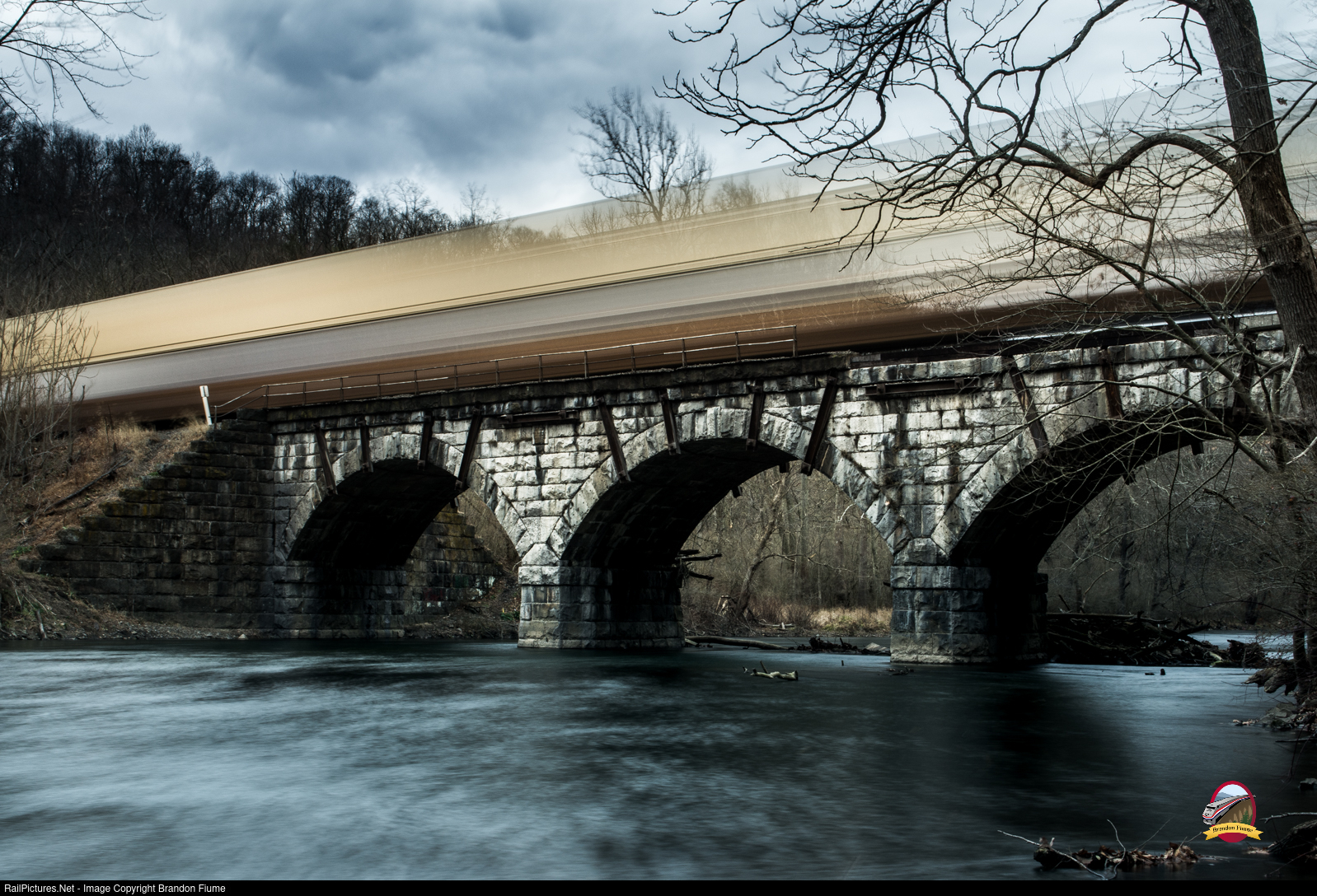 The rear of a westbound intermodal train crosses the Little Juniata River near Spruce Creek. This stone arch bridge is one of many on the PRR Middle Division as the railroad crosses this windy river multiple times.