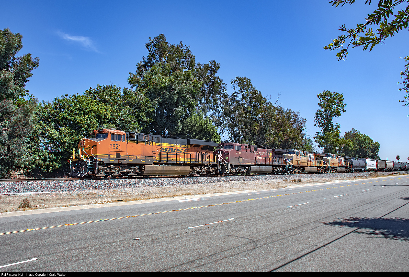 BNSF ES44C4 8347, Dash 9-44CW 5109, ES44DC 7417 and ES44DC 7899 are supplying a combined 17,600 horsepower to get Priority UPS-LTL Intermodal train Z-LACNYC7-31 across the road as it heads from Los Angeles to New York City. Or, at least, LA to Chicago, at which point the BNSF power may be swapped for Norfolk Southern Power. (Fullerton, California – August 31, 2021)