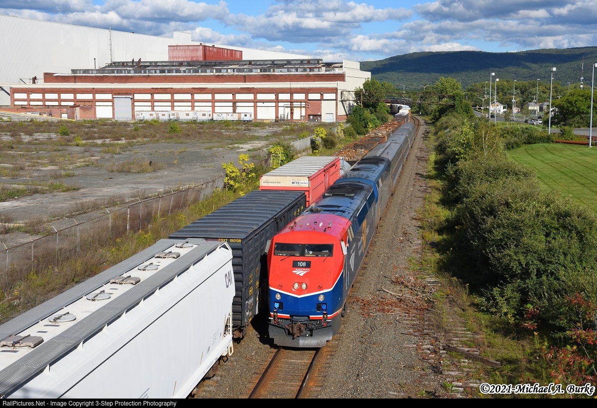 Train 449, the Boston section of Amtrak’s Lake Shore Limited, is passing the site of the former General Electric Plant in Pittsfield, MA. Leading the consist to Albany-Rensselaer is P42 108 in Phase VI, the first adaptation of the latest Amtrak livery. There are six locomotives painted celebrating Amtrak’s 50th Anniversary.