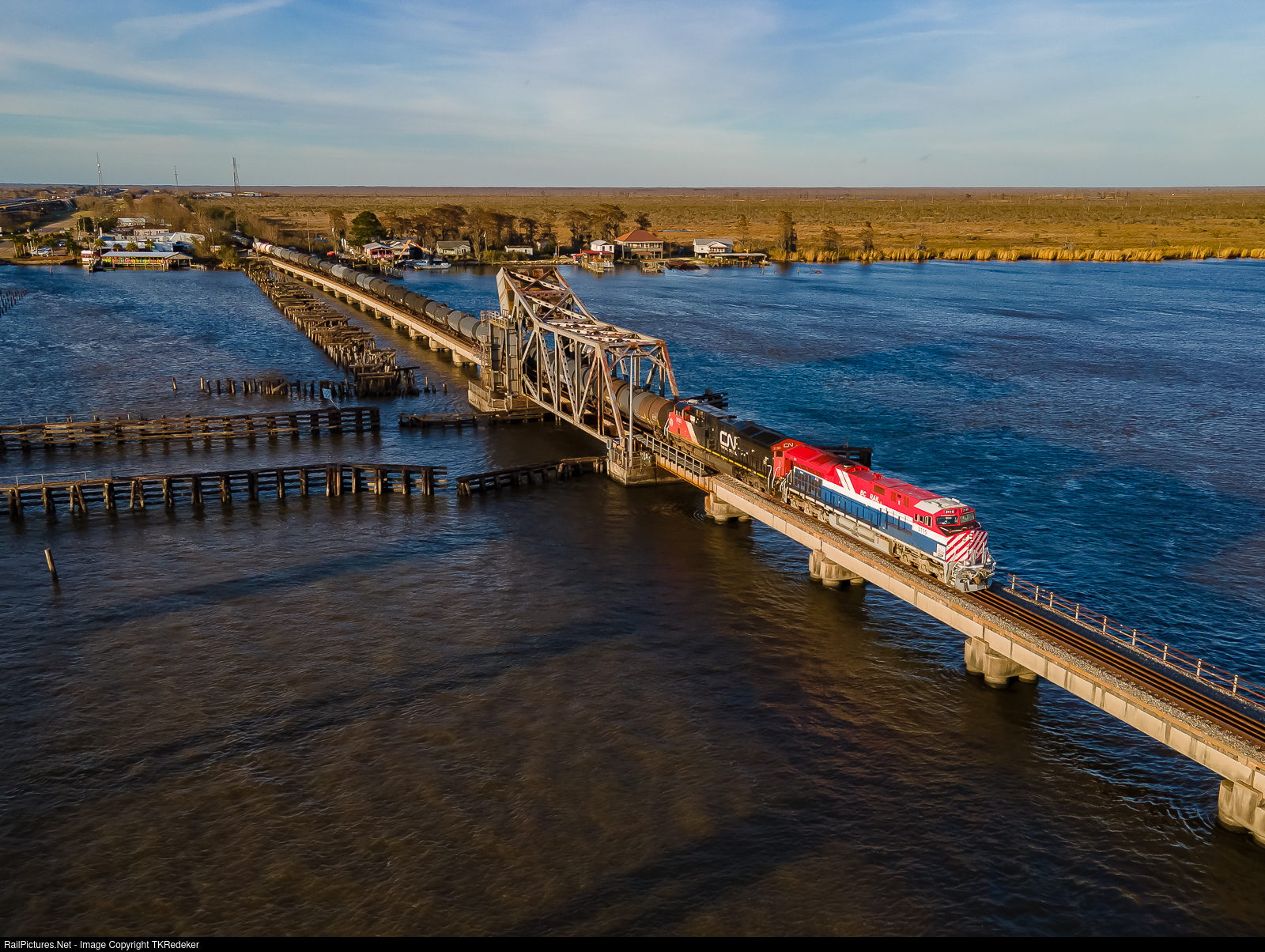 Canadian Nationals BC Rail Heritage unit leads train A420 across the Pass Manchac draw bridge in beautiful late afternoon light.