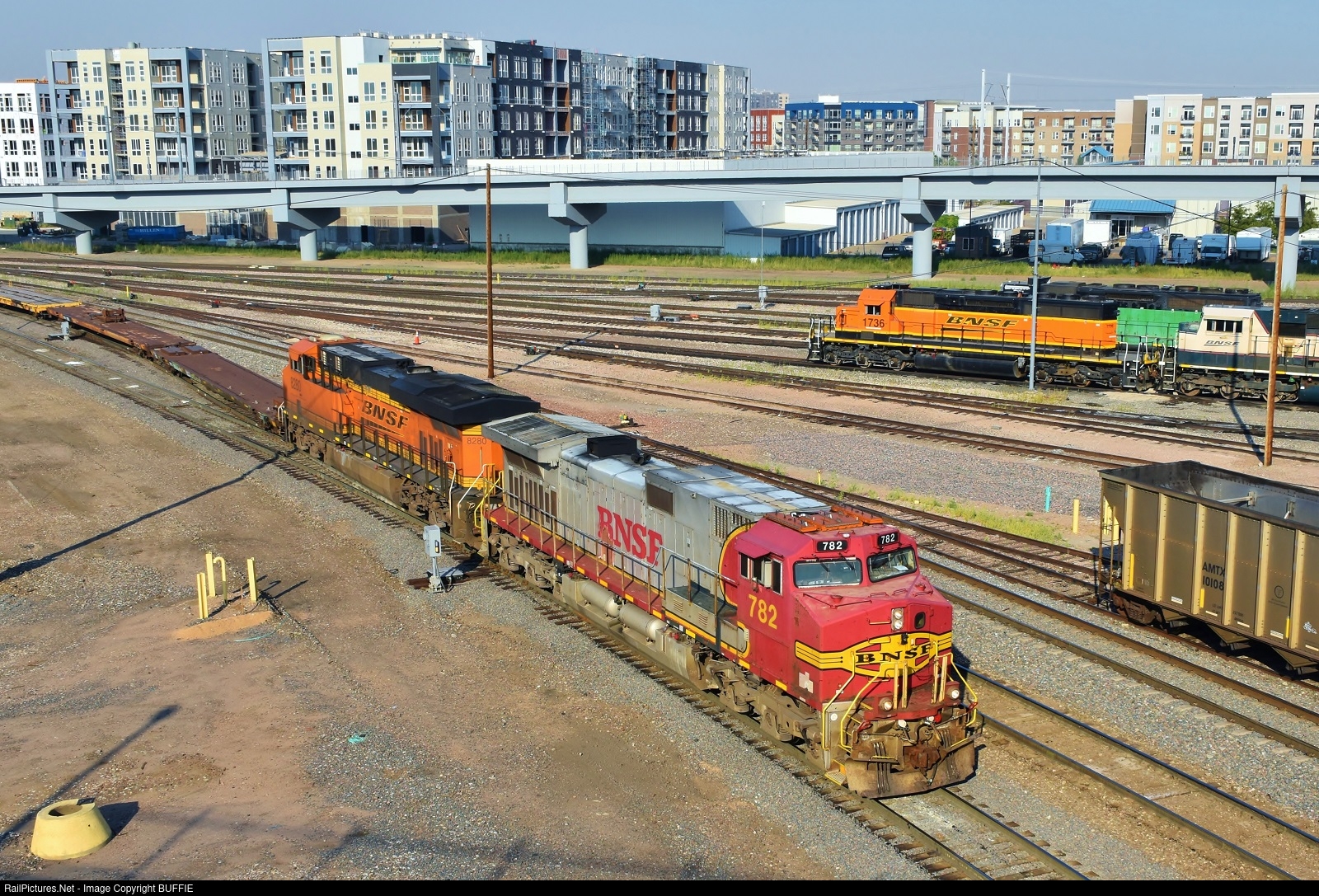 | BNSF Warbonnet 782 (Dash 9) runs through the Denver Yard, passing to other 'old school' engines including an Executive Grinstein and a Burlington Northern Cascade Green hiding in the back. |