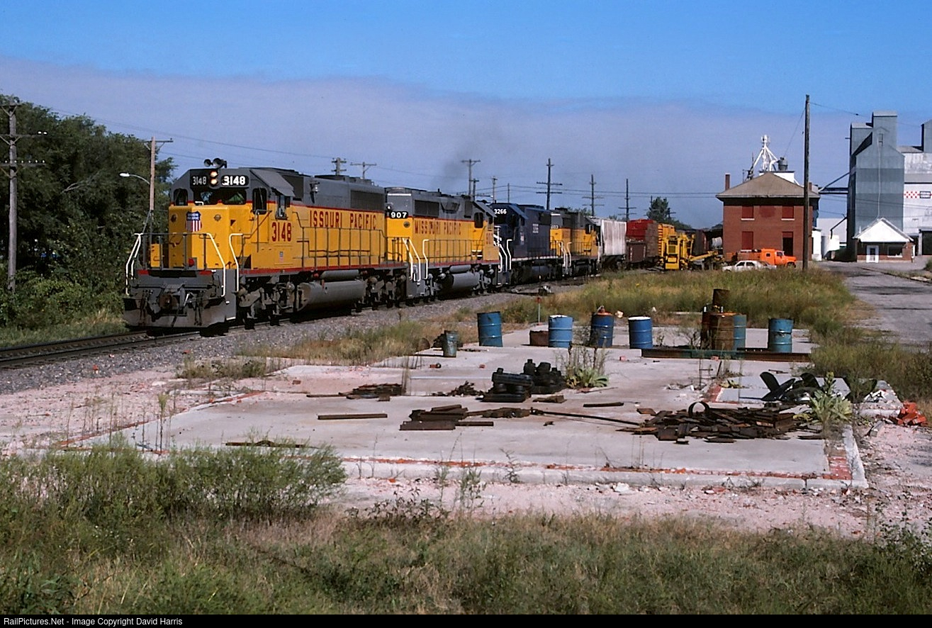 All four locomotives passing the foundation of MP's Independence passenger station are Missouri Pacific - sort of. All are lettered Missouri Pacific, but only the third unit (SD40-2 3266) is 100% MP, still in Jenks blue. The lead unit is a Mopac loco, but in Armour yellow. Second unit is GP40-2 907 in yellow, but it is a former Western Pacific loco (3552, delivered 4/80). The trailing unit is GP40 603 in yellow, but it was originally CRI&P (343, delivered 9/66).