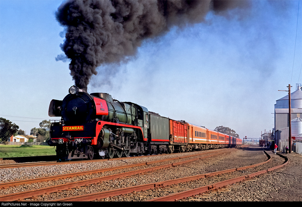| Operating a regular passenger service from Geelong to Melbourne for crew training, R766 hauling 3 N sets departs Lara Station. |