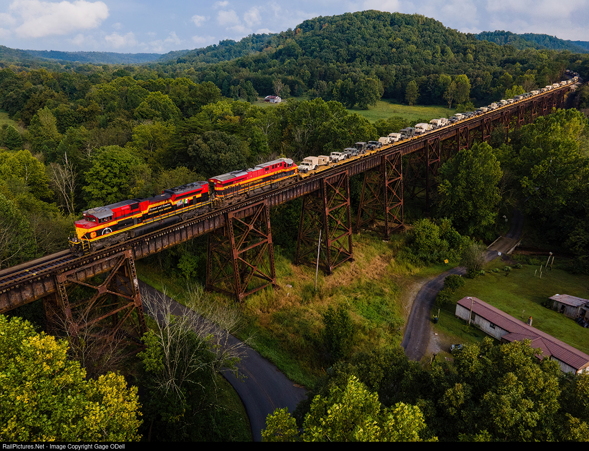 | NS 057, a military train bound for Camp Atterbury, IN, crosses the Green River Trestle at South Fork with the Honoring KCS Heroes unit in charge |