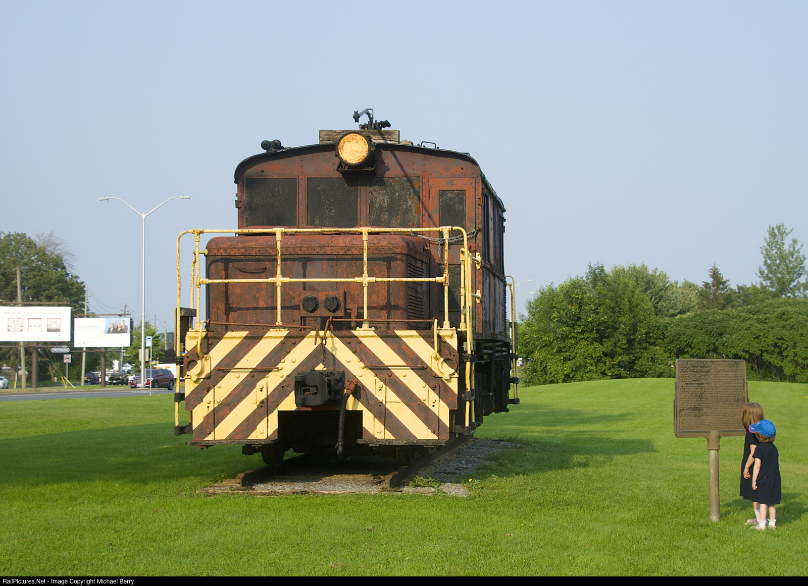 | Bound for Smiths Falls. My two daughters look up at the electric steeplecab preserved in a park in Cornwall. It was operated in Cornwall between 1963 and 1971 by the Cornwall Street Railway, which was taken over by CN in 1971. It was built in 1930 for the Salt Lake & Utah Railway. It is supposed to be moved to the Railway Museum of Eastern Ontario in Smiths Falls in the near future. |