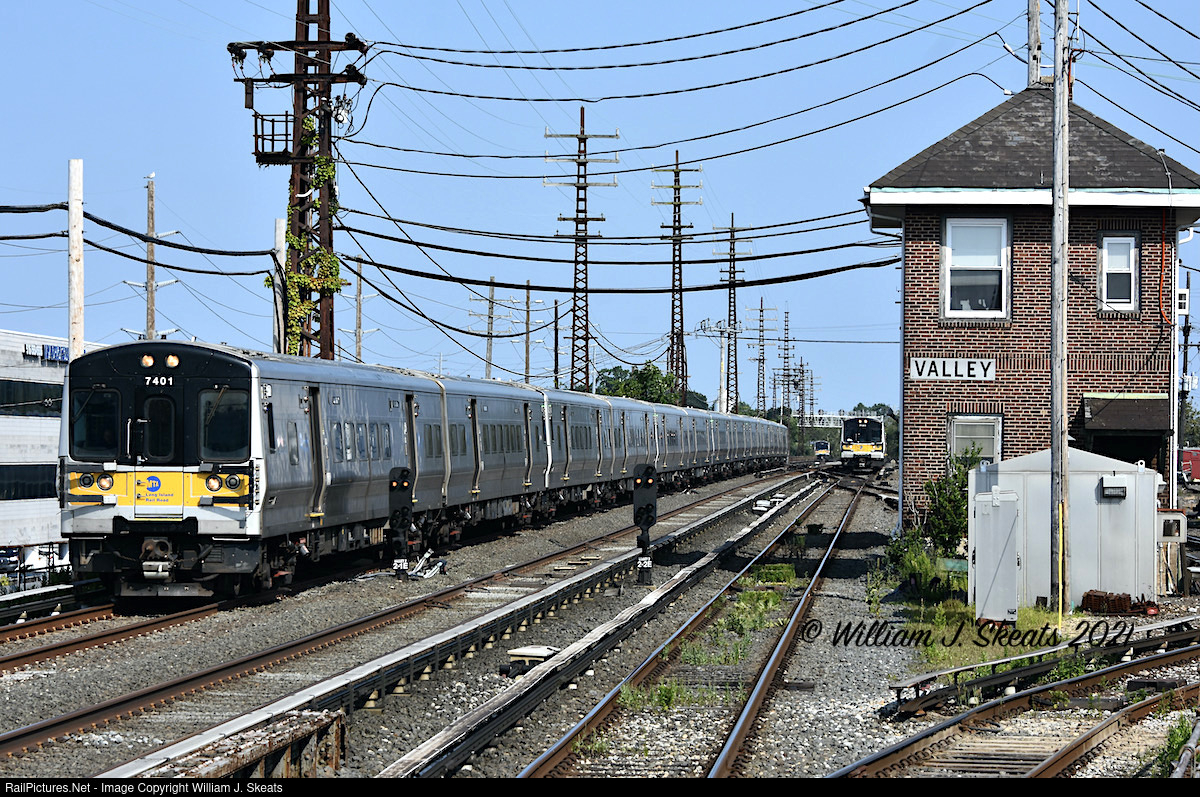| Train 123 from Babylon heading west. M7 7401 and 12 cars on Montauk 1. Train 861 on Long Beach 1 about to pass Valley Tower heading west. Train 861 has M7 7141 and 10 cars to Penn Station. In the distance you will see the train to West Hempstead about to enter the West Hempstead Branch. |
