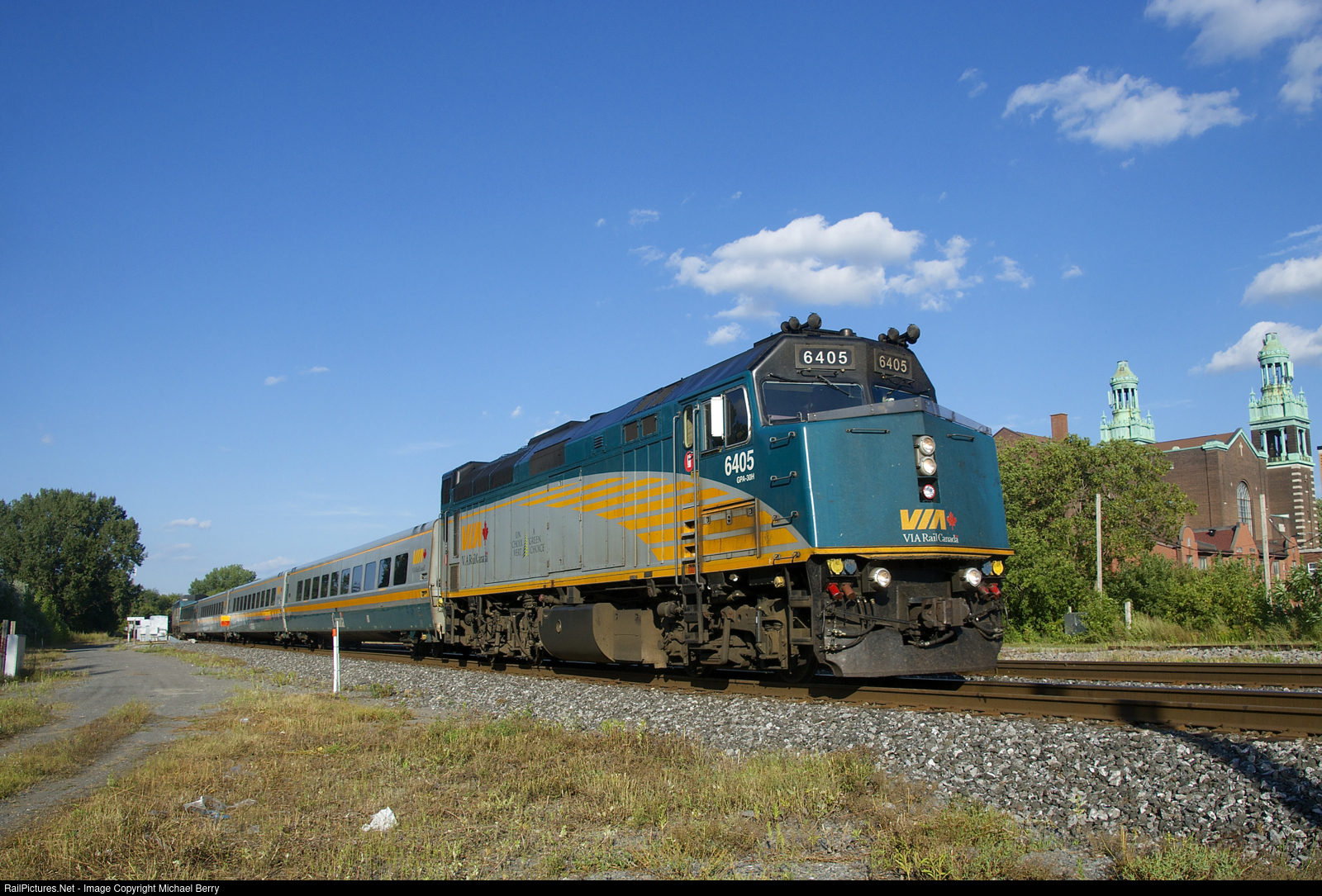 VIA 69 with VIA 6405 leading passes the Saint-Zotique Church.