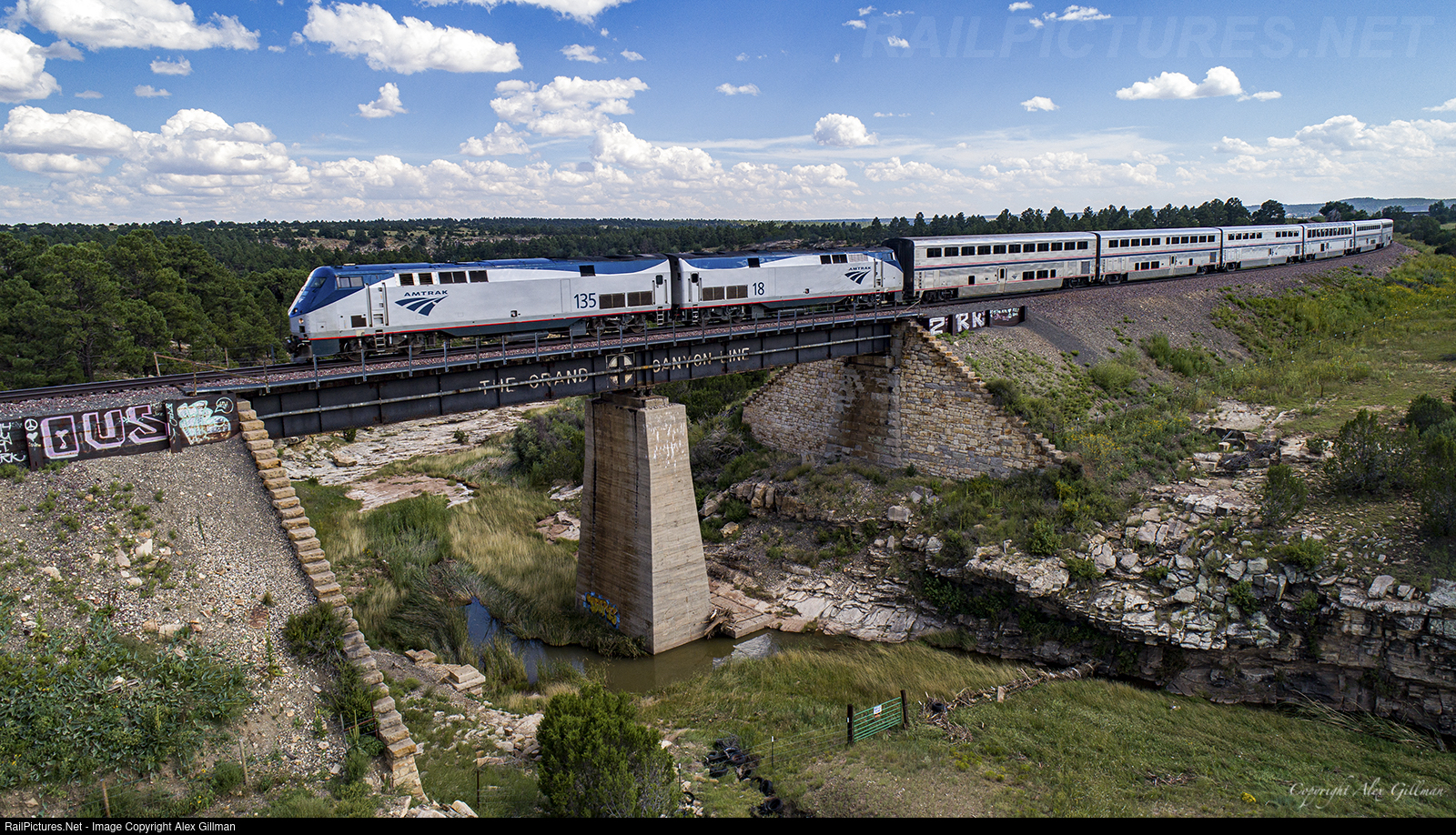 The Grand Canyon Line Lives. Dating back to the glory days of this rail line's original owner, the Atchison, Topeka and Santa Fe Railway, this bridge crossing found just south of Las Vegas, New Mexico still proudly wears it's 1920's paint that reads "The Grand Canyon Line" on both sides of a Santa Fe logo. Serving as part of the BNSF's Glorieta Subdivision, this bridge span and the subdivision overall now only see the daily passages of Amtrak's Southwest Chief's. Running slightly tardy now after having to wait to meet it's westbound counterpart, today's eastbound Southwest Chief, piloted by the 21-year-old AMTK 135, hustles across the span on its approach to its next station stop of Las Vegas.