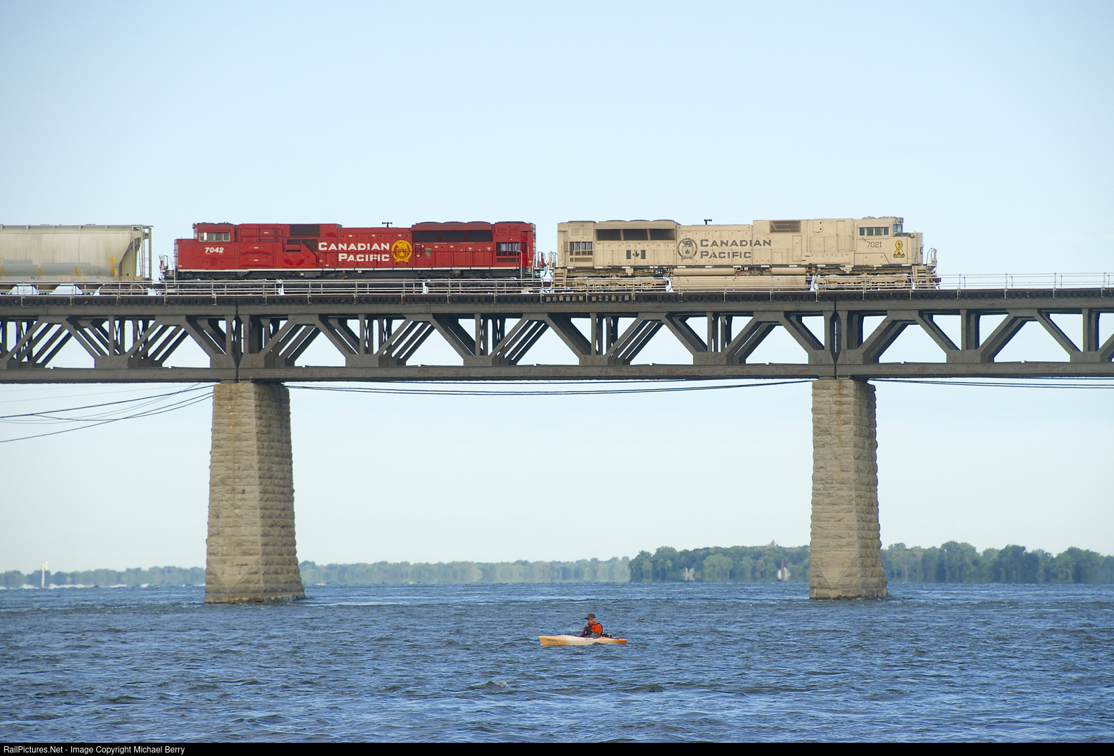CP 7021 & CP 7042 lead CP 253 over the St. Lawrence River as a kayaker passes underneath.