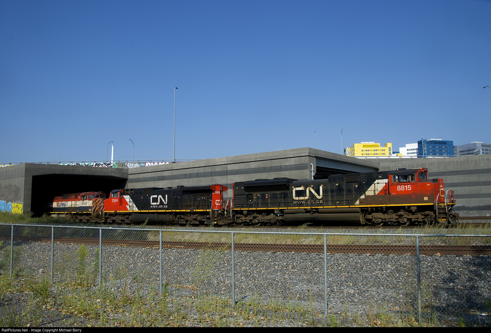 | A dirty SD70M-2 leads CN 120 out of the Turcot Interchange. Units are CN 8815, CN 2569 & BCOL 4642, with CN 8920 mid-train. |