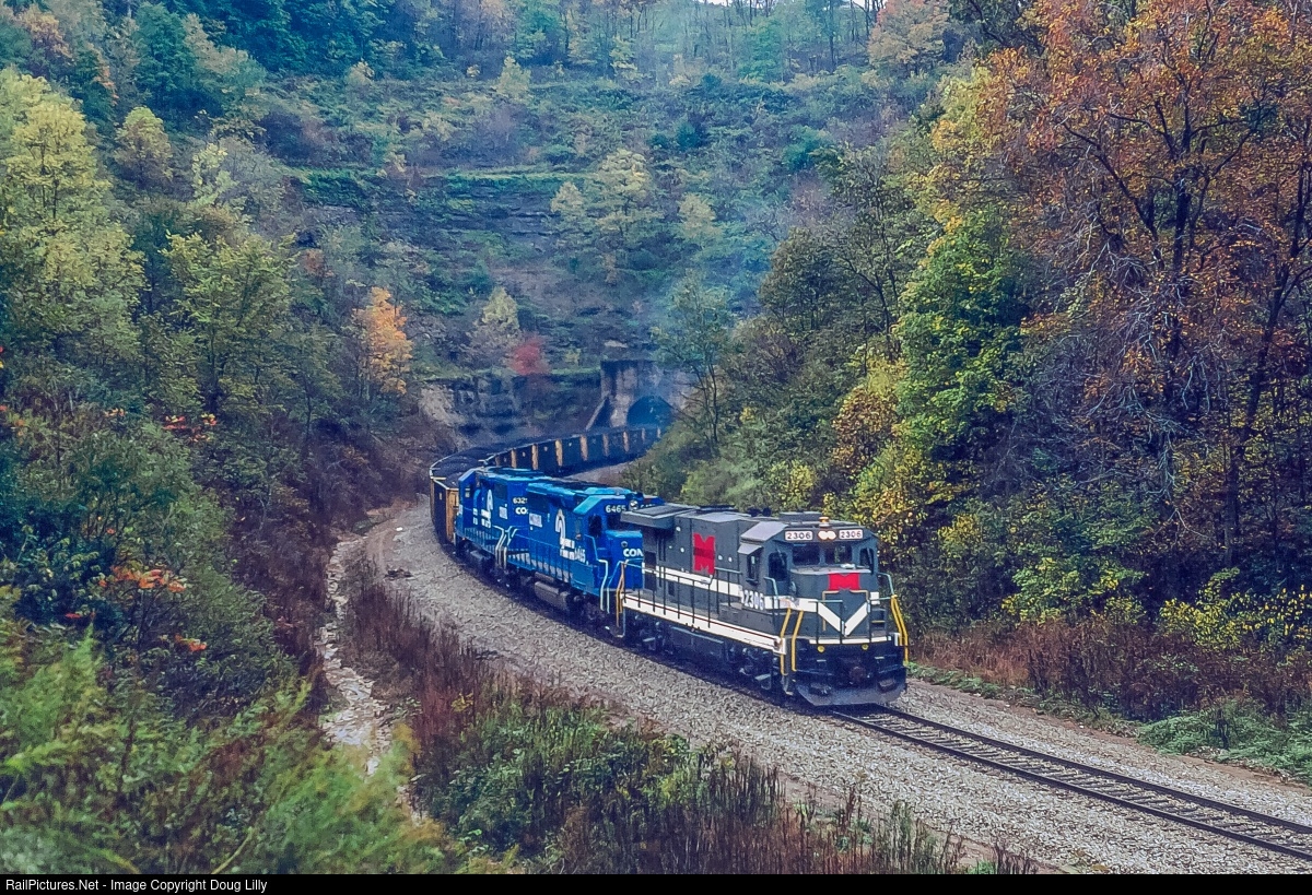 A Monongahela Super 7-23B and two Conrail SD40-2’s pull Somerset coal out of the MGA’s Waynesburg & Southern tunnel at White Cottage, Pennsylvania. The last mine on the W&S shut down recently, and this tunnel may very well have seen its last revenue train.