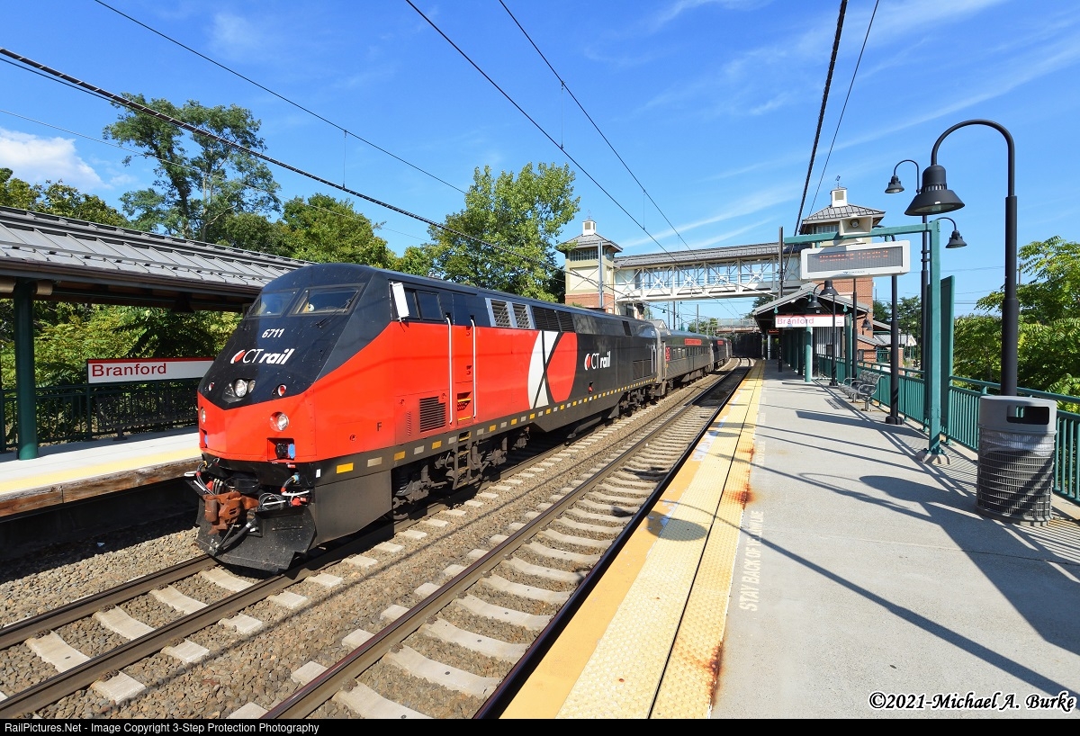Shore Line East train 3645 arrives at Branford station on a Saturday afternoon in September. The road grime shows up well on the newly rebuilt CTrail P40BH.