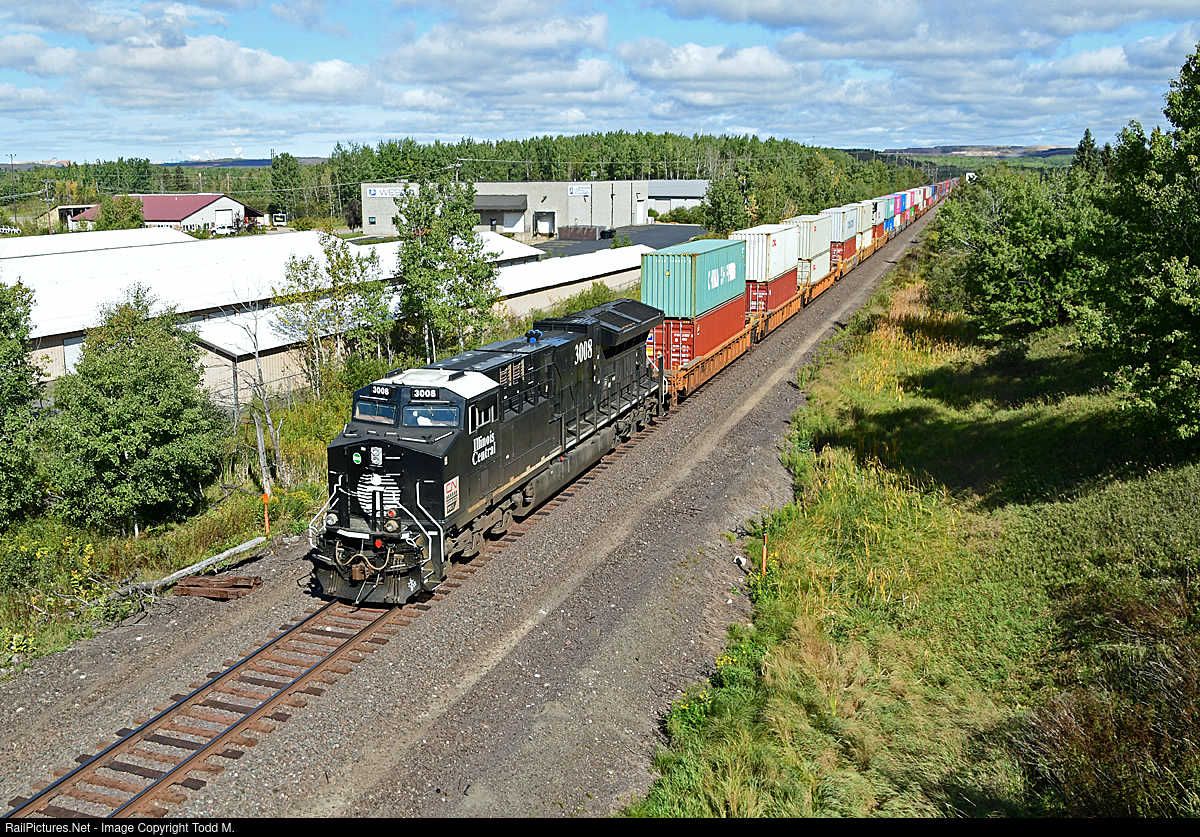 CN 3008, the Illinois Central heritage scheme, is northbound on the CN Rainy Sub at Virginia, MN as the DP unit on this Q train headed for Ranier and the crossing over the Canadian border and points west.