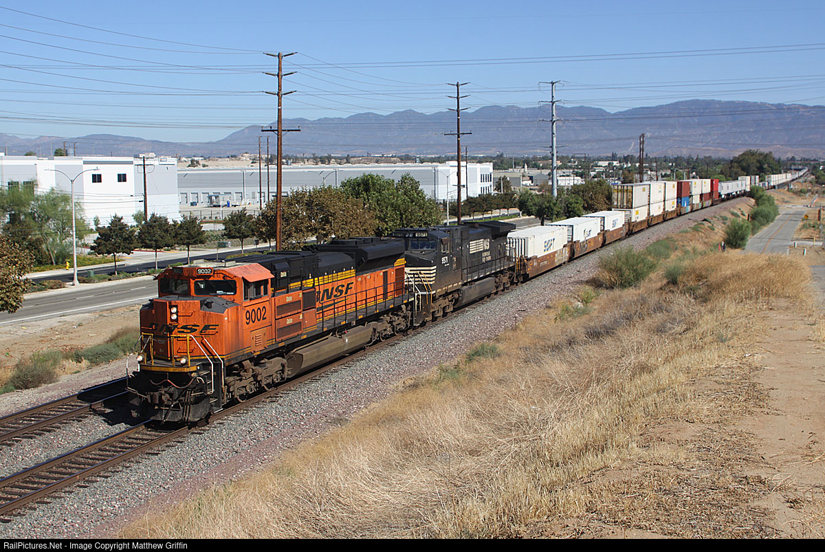 BNSF 9002 along with an NS unit double down on a long westbound intermodal at Colton.