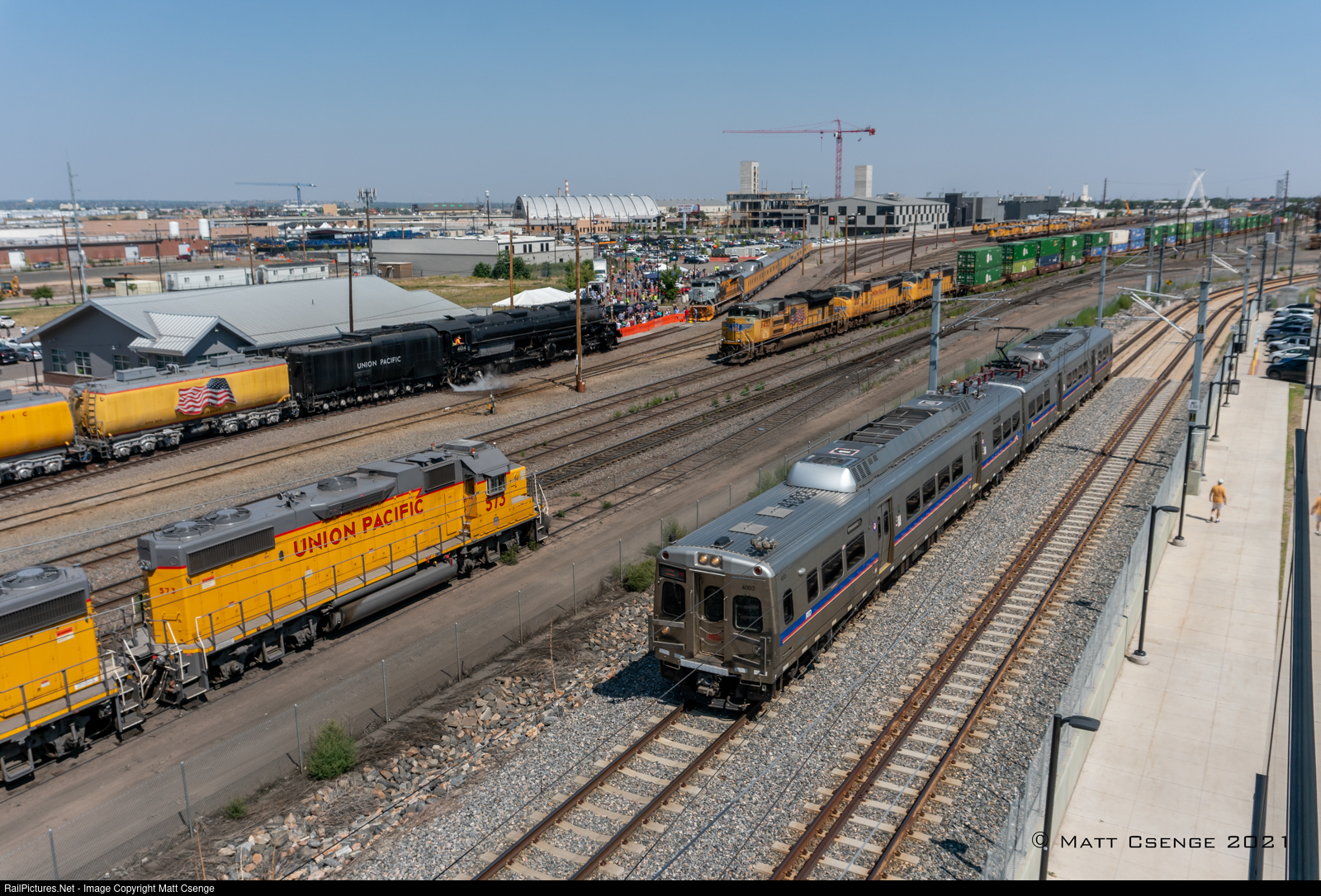 Union Pacific 4014 spent Labor Day 2021 on display with UP 1989, the Rio Grande heritage unit, at the railroad's Denver Yard; the last stop on the Big Boy's summer excursion before returning to Cheyenne. The Regional Transportation District's A Line runs along the southern edge of the yard, allowing this unique view of the three major types of railroad motive power in the United States - all of which were under their own power!