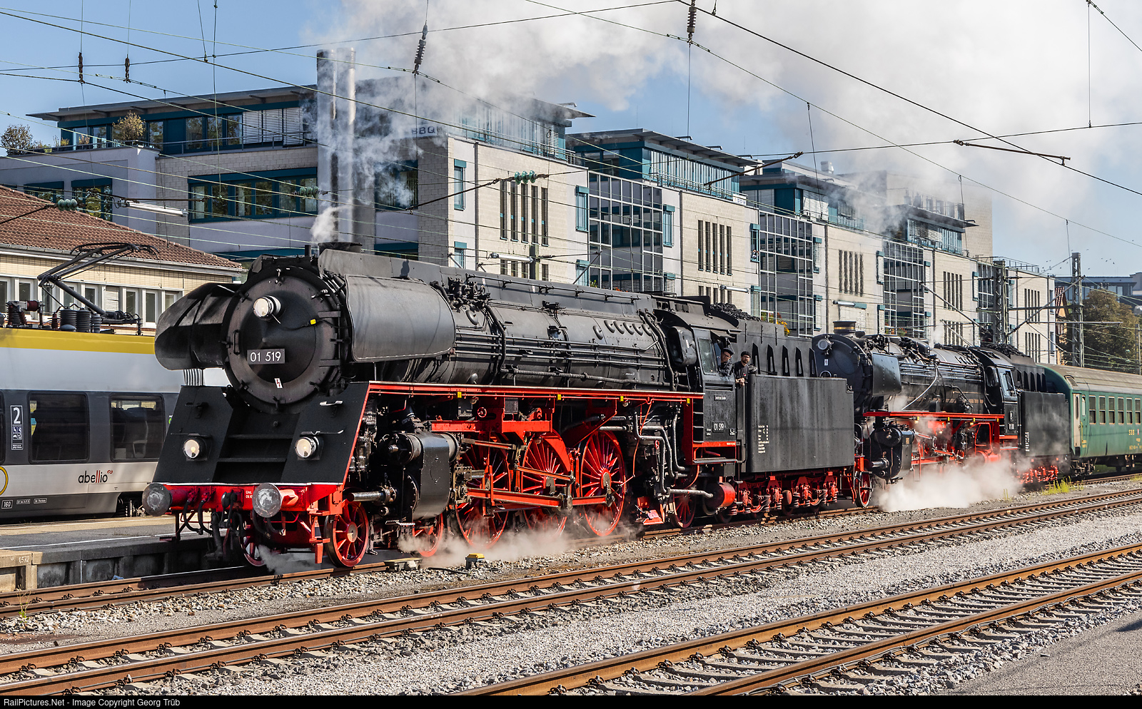 | The 4-6-2 former Deutsche Reichsbahn (DR of the German Democratic Republic) express train steamlocomotive 01 # 519 (01.5 Reko) of the Eisenbahnfreunde Zollernbahn (EFZ) is leading in front of the 01 # 202 of Verein Pacific 01 202 in Lyss, entering Tübingen with train DPE 63041 of the IGE from Stuttgart via Plochingen-Tübingen-Albstadt-Ebingen-Sigmaringen-Aulendorf-Friedrichshafen-Lindau Insel-Immenstadt-Kempten to Augsburg. This was on the first day of the 5-day journey "Dampflok-Spätsommer in Deutschland" for celebration of 25 (26) years of IGE/Eisenbahn-Romantik Reisen. |