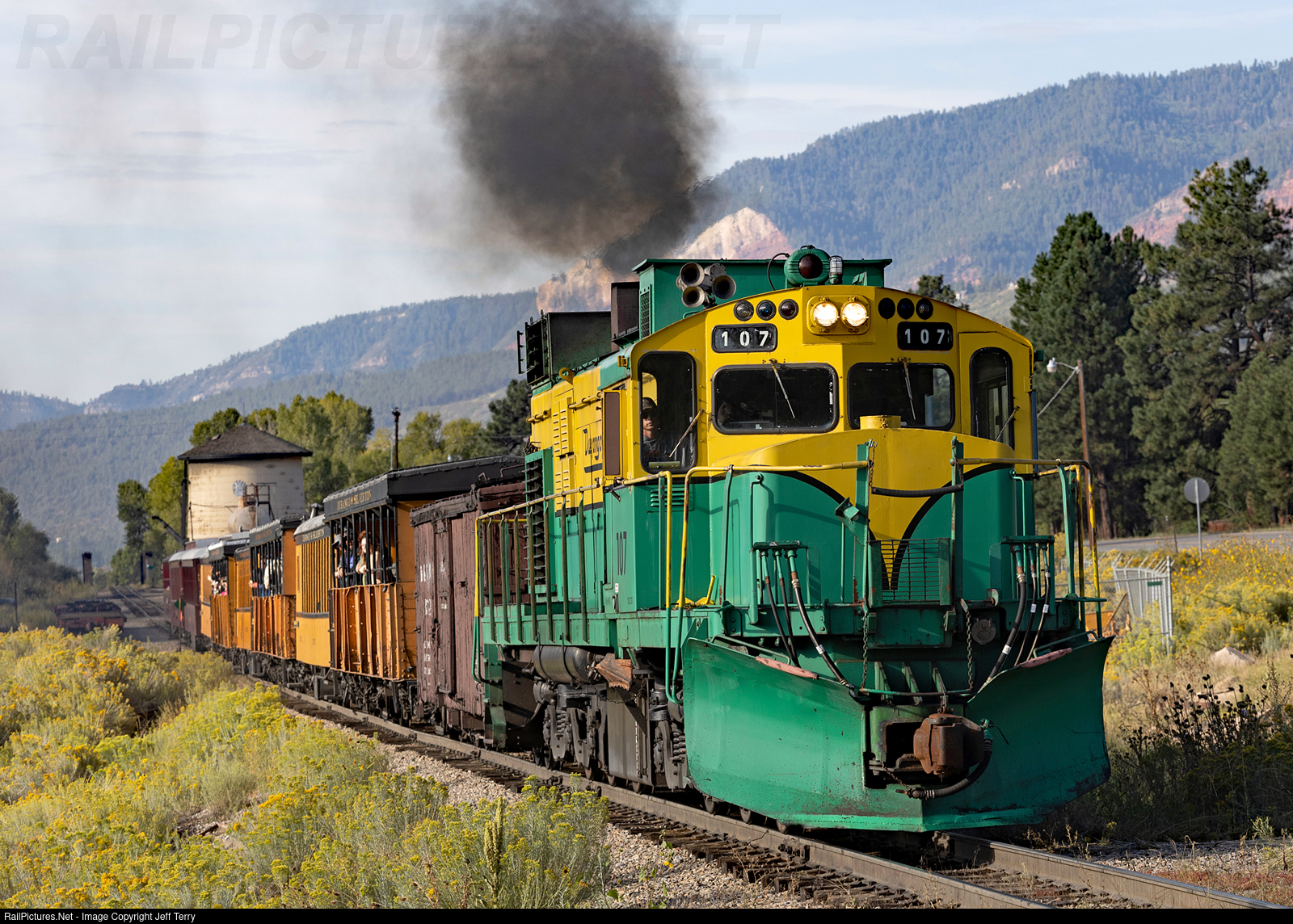 Not-yet-repainted ex-White Pass Alco DL-535E 107 accelerates out of Hermosa, Colorado, heading for Silverton. Train 461, the 0800 train out of Durango, is currently powered by a diesel locomotive. The 0900 Silverton Train and 0930 Cascade Canyon trains are steam powered.