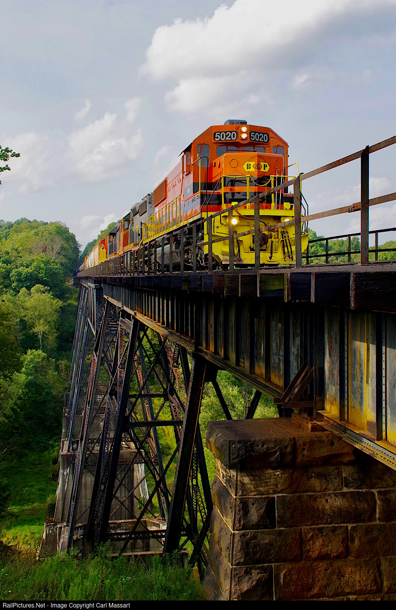| Soaring over the Little Mahoning Creek valley on a trestle built by the Pencoyd Iron Works in 1899 and upgraded in 1941, engine 5020 leads three other EMD engines northbound to Riker Yard in Punxsutawney. An impressive structure that has withstood the test of time. |