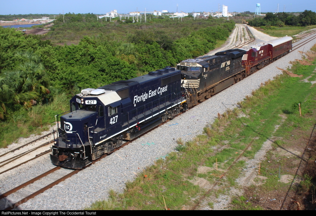 | Second run of the NS Geometry train down the entire length of the FEC for 2020. In the background, if you look up from the roof of #427, you will see the ROW being plowed for upcoming BrightLine tracks that will tie into FEC here. |