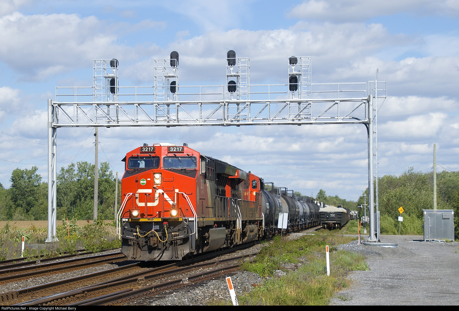 | CN 585 has CN 3217, CN 3864 and 58 cars as it passes a signal bridge located where the CN Kingston Sub goes from four to two tracks. At right cars are stored on Track 4. |