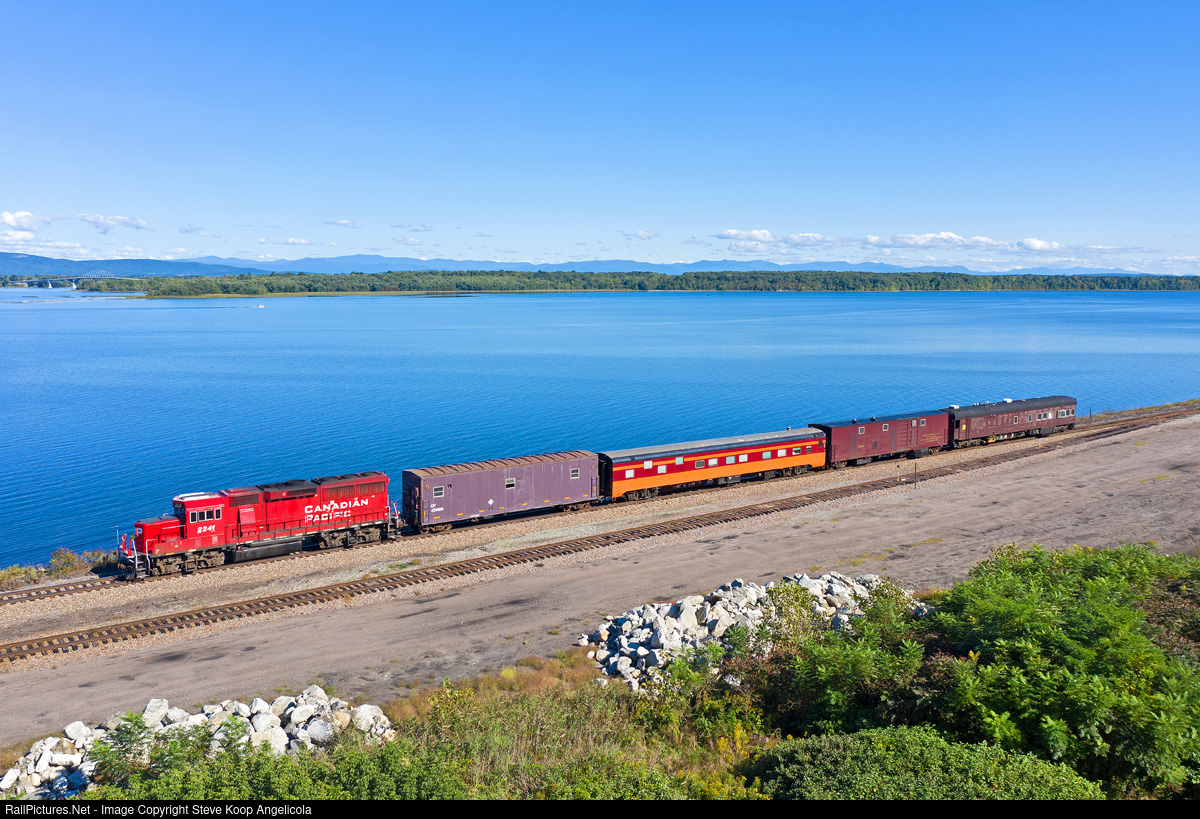 The Canadian Pacific Tec Train rolls along Lake Champlain at Port Henry, NY as they test the track along the way. EMD GP 20C-ECO CP 2241 is the power for this trip down the D&H.