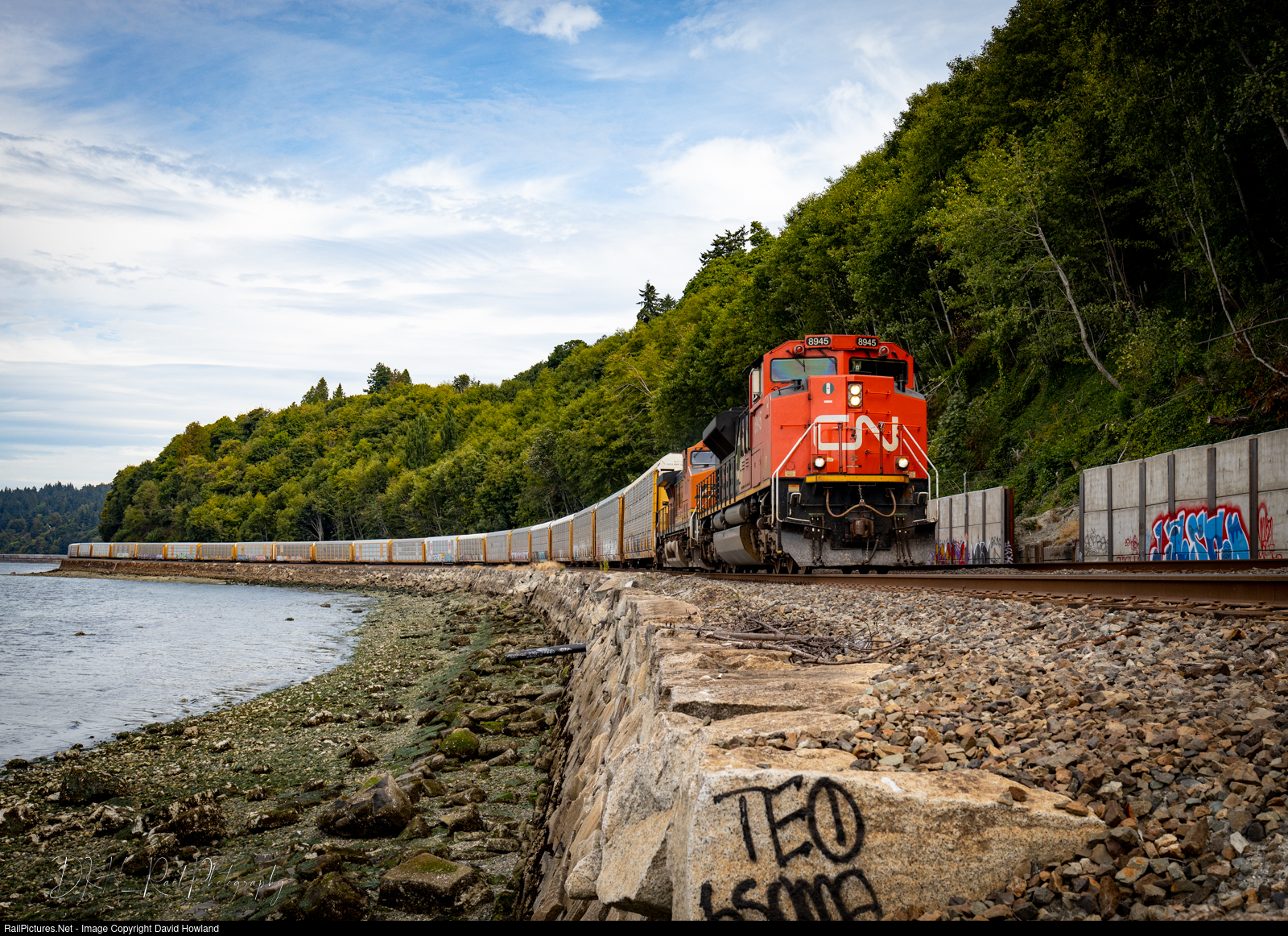 CN 8945 glides along the Puget Sound on a clear August morning.