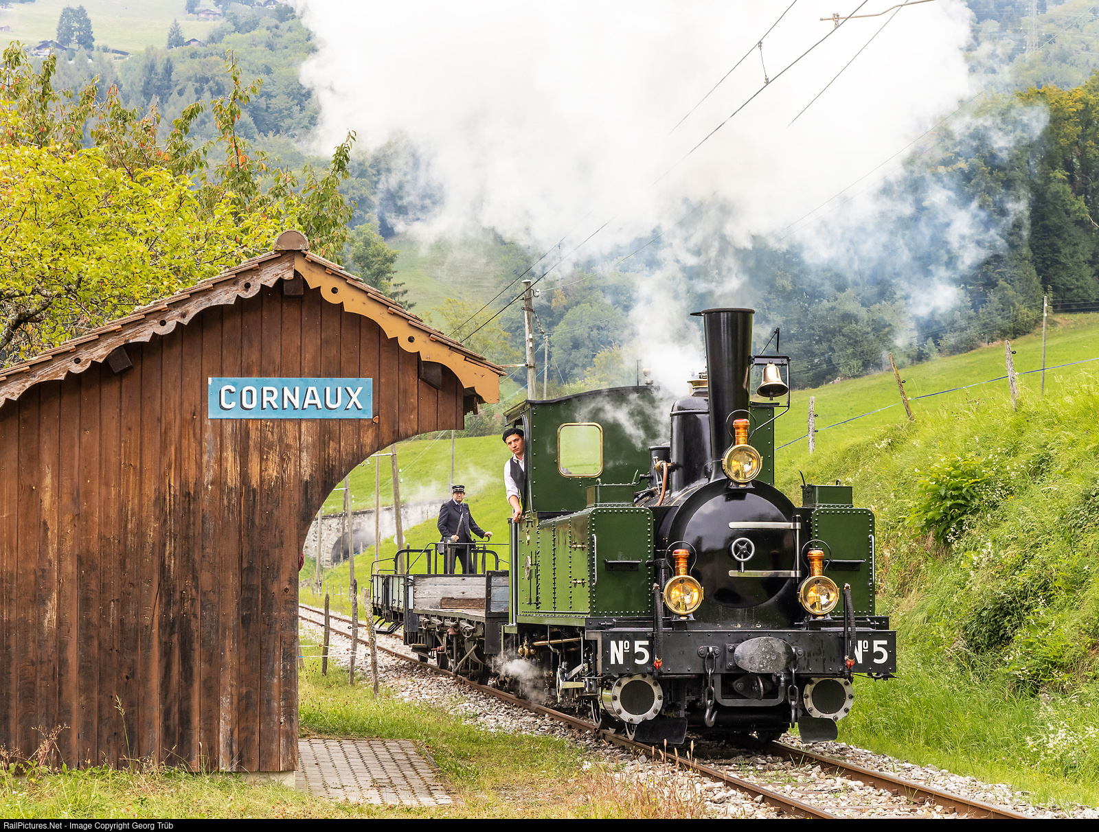 G 3/3 # 5 of the former Lausanne-Echallens-Bercher Railway (LEB), built in 1890 by SACM (Societe Alsacienne de Constructions Mecaniques SACM, Graffenstaden), since 1973 running for the Blonay-Chamby museum railroad, with a short freight train passing the Cornaux stop on the occasion of the "Tramorama" photo event.