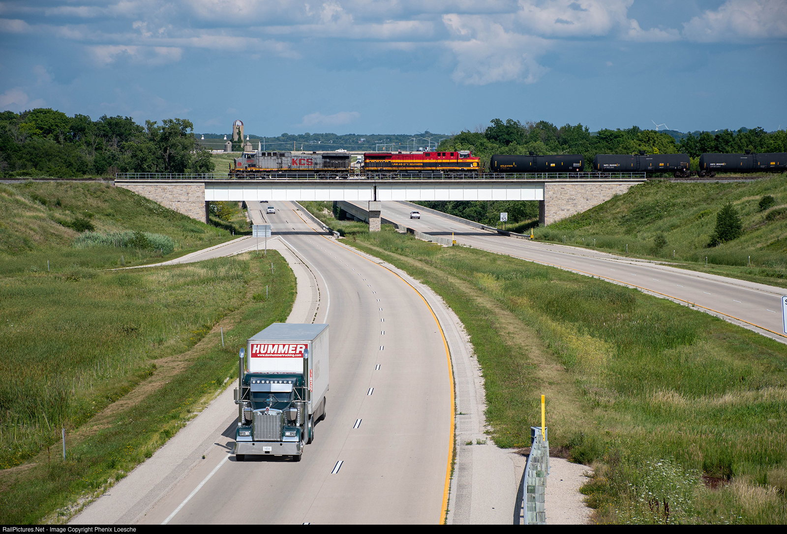 | KCSM 4517 brings CN northbound U757 into Fond du Lac, WI. Down below, a Kenworth W900 is heading westbound on US 151. |